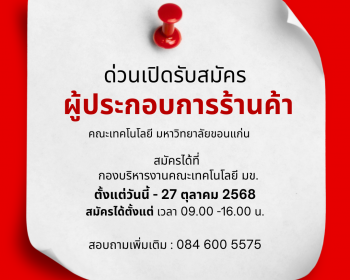 เปิดรับสมัครผู้ประกอบการร้านค้า คณะเทคโนโลยี มหาวิทยาลัยขอนแก่น สมัครได้ที่ กองบริหารงานคณะเทคโนโลยี มข. ตั้งแต่วันนี้ – 27 ตุลาคม 2568 สมัครได้ตั้งแต่ เวลา 09.00 -16.00 น.