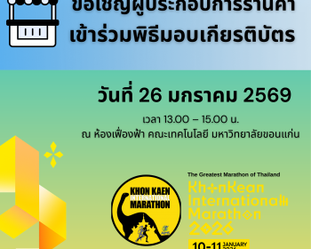 📣 ขอเชิญผู้ประกอบการร้านค้า ที่ได้เข้าร่วมงาน ขอนแก่นมาราธอนนานาชาติ 2026 เข้าร่วม พิธีมอบเกียรติบัตร เพื่อแสดงความขอบคุณและเชิดชูความร่วมมือของผู้ประกอบการร้านค้า ที่มีส่วนสำคัญในการสนับสนุนและร่วมขับเคลื่อนความสำเร็จของการจัดงานในครั้งนี้ 🗓 วันจันทร์ที่ 26 มกราคม พ.ศ. 2569 ⏰เวลา 13.00 – 15.00 น. 📍ณ ห้องเฟื่องฟ้า คณะเทคโนโลยี มหาวิทยาลัยขอนแก่น ทั้งนี้ เพื่อเป็นการแสดงความขอบคุณและยกย่องความร่วมมืออันดีที่มีมาโดยตลอด กรณีผู้ประกอบการไม่สามารถเข้าร่วมพิธีได้ด้วยตนเอง สามารถมอบหมายตัวแทนเข้ารับเกียรติบัตรแทนได้ จึงเรียนมาเพื่อโปรดพิจารณาเข้าร่วมพิธีตามวัน เวลา และสถานที่ดังกล่าว คณะเทคโนโลยี มหาวิทยาลัยขอนแก่น ขอขอบคุณเป็นอย่างสูงมา ณ โอกาสนี้