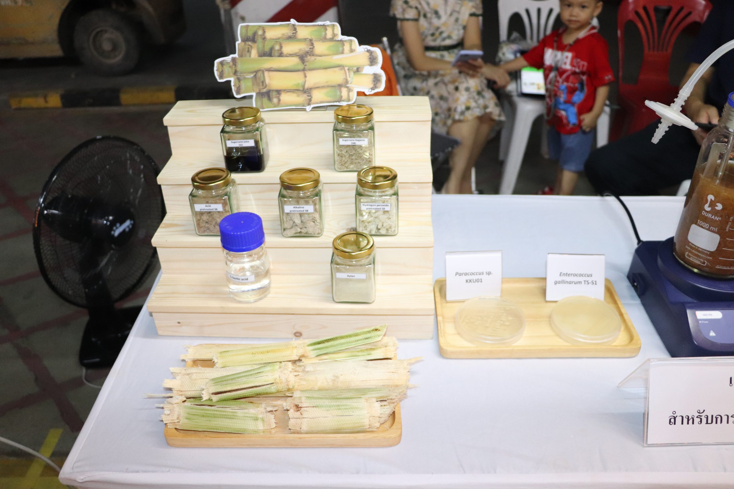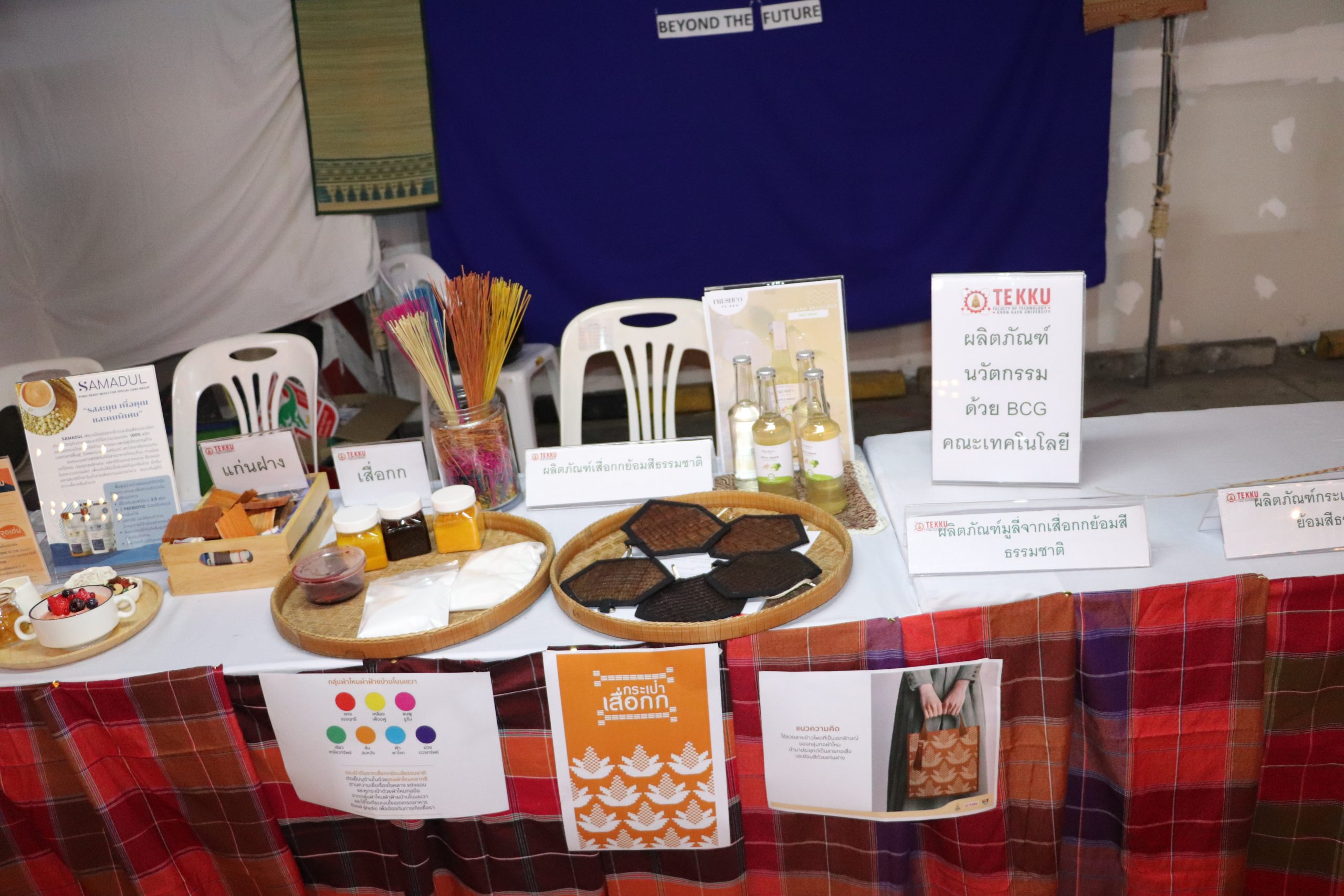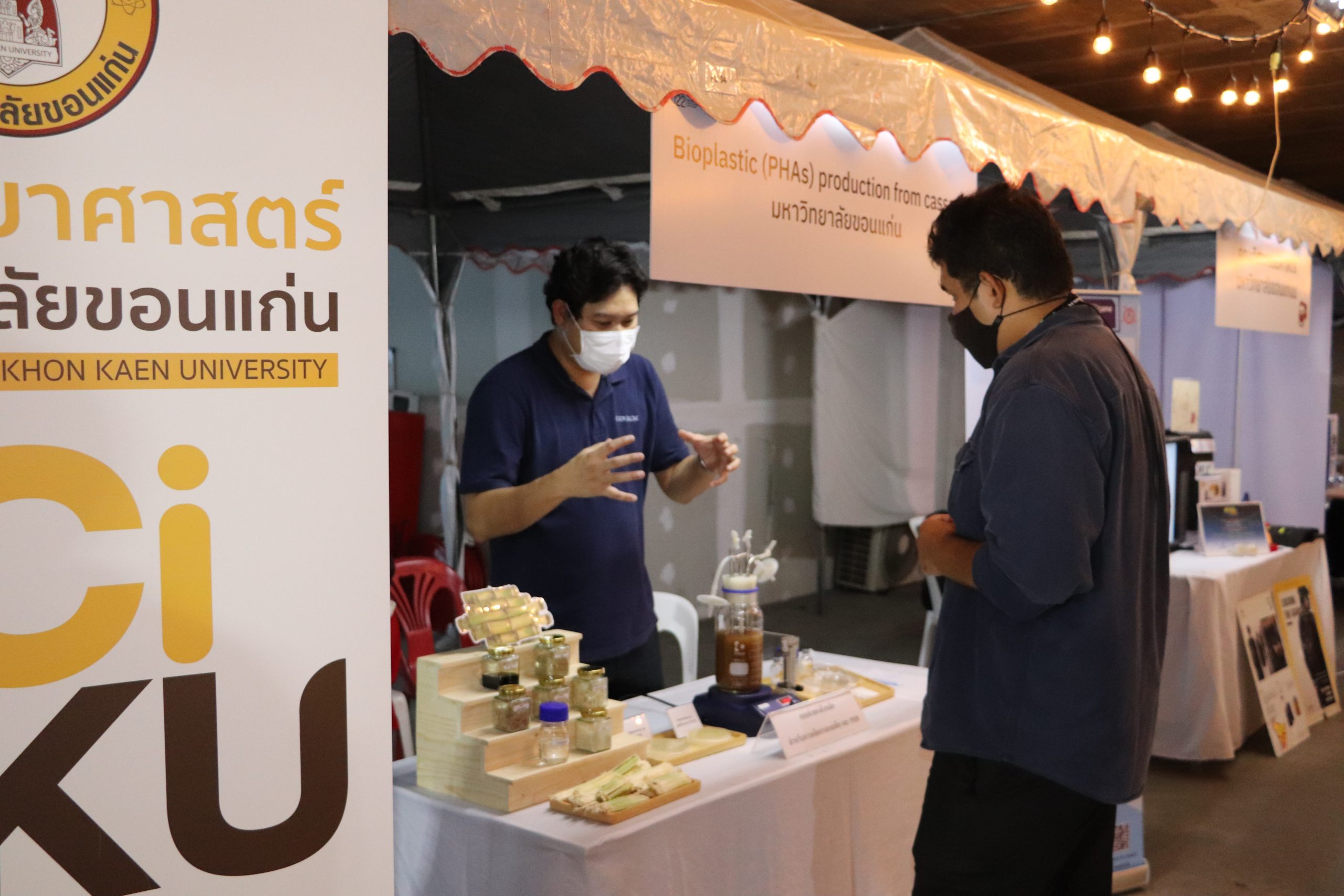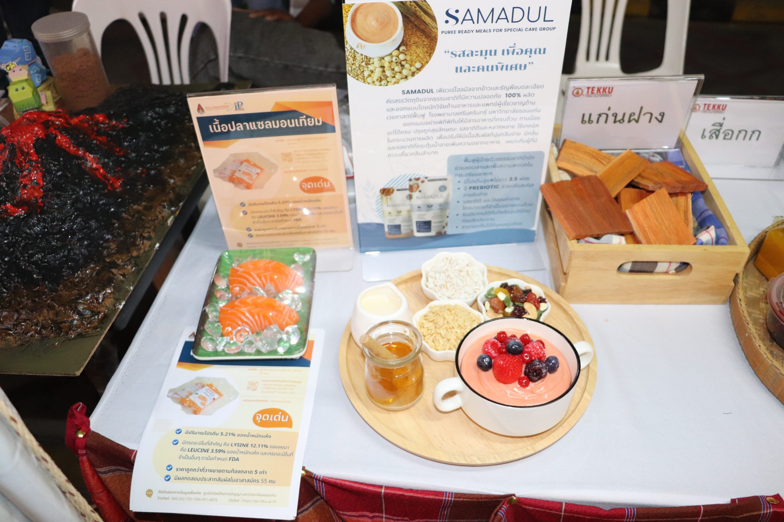 ซึ่งทาง คณะเทคโนโลยี มข. ได้เข้าร่วมงานและเปิดบูธ สำหรับในส่วนของ ผศ.ดร.อัมพร แซ่เอี่ยว ได้นำ เนื้อปลาแซลมอนเทียม ผลิตภัณฑ์เสื่อกกย้อมสีธรรมชาติ และ เครื่องดื่ม TE FRESHCO มาแสดงในงานนี้ ในส่วนของ ผศ.ดร.อภิลักษณ์ สลักคำ ได้นำ แบบจำลองถังหมัก สำหรับการผลิตกรดแลกติก และ PHB มาแสดงในงาน และ ส่วนของ ผศ.ดร.วิมลทิพย์ สิงห์เถื่อน ได้นำ โมเดล Geotourism และ เกมส์-รูปภาพ เกี่ยวธรณีวิทยา มาแสดงในงานนี้ ในส่วนของ ผศ.ดร.เพ็ญศรี ปลั่งกลาง ได้นำ สีย้อมธรรมชาติจาก แก่นฝางและผงขมิ้น สำหรับกระเป๋าและเสื่อกก มาแสดงในงานนี้ และ ในส่วนของ อาจารย์ ดร.พิมพ์นิภา หิรัณย์สร ได้นำ ผลิตภัณฑ์อาหารสำหรับผู้ป่วยภาวะกลืนลำบาก มาแสดงในงานนี้