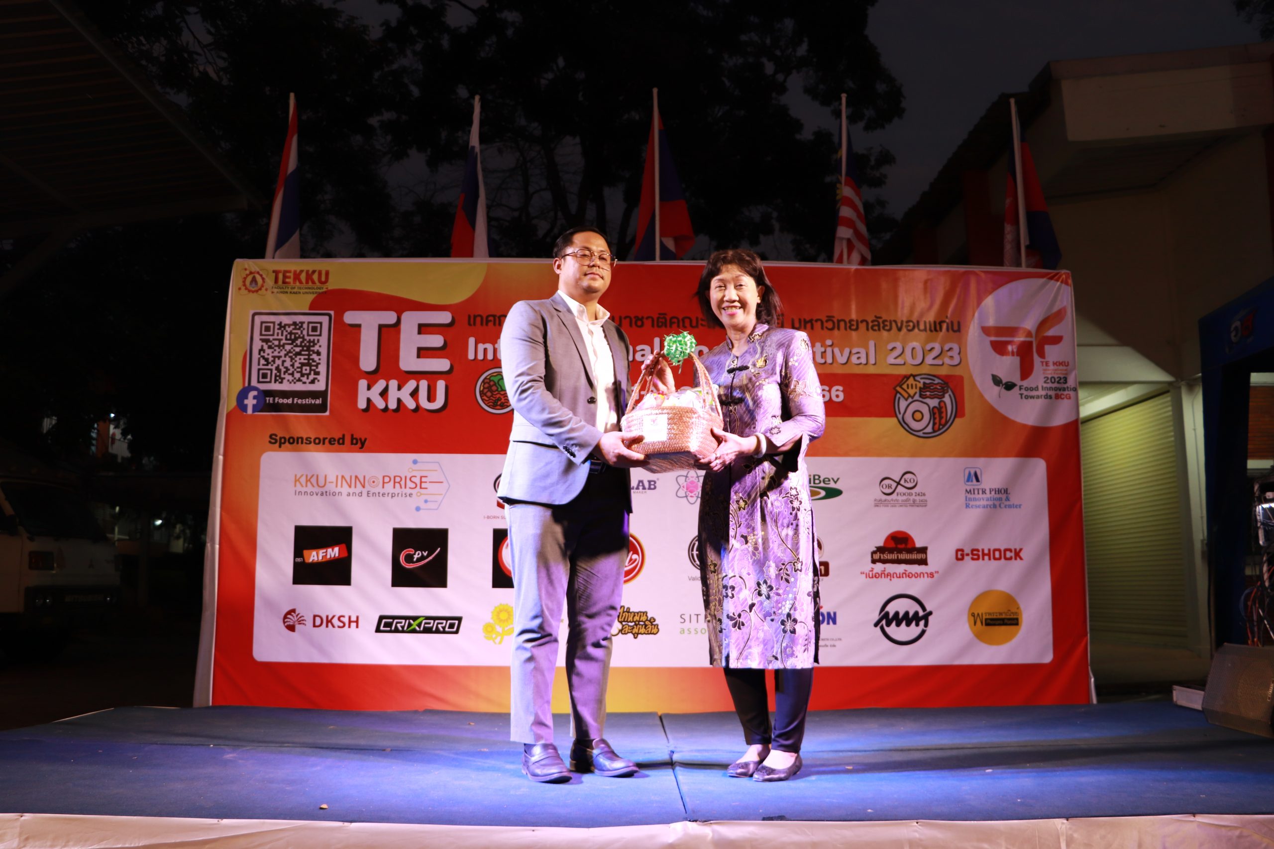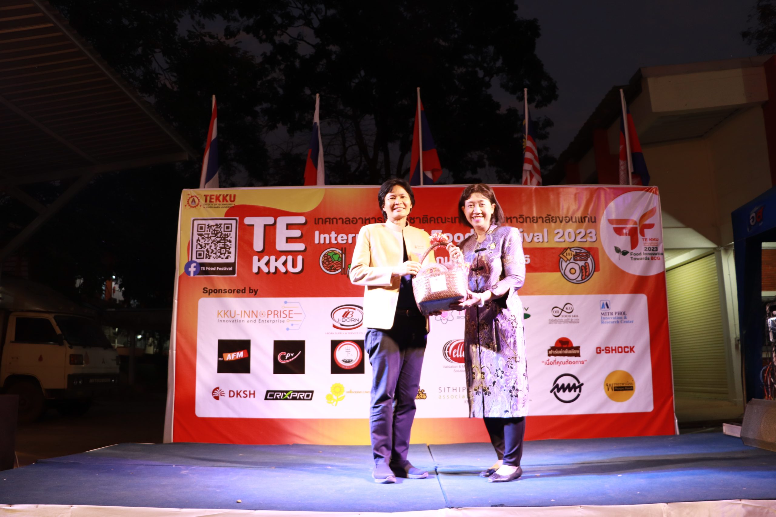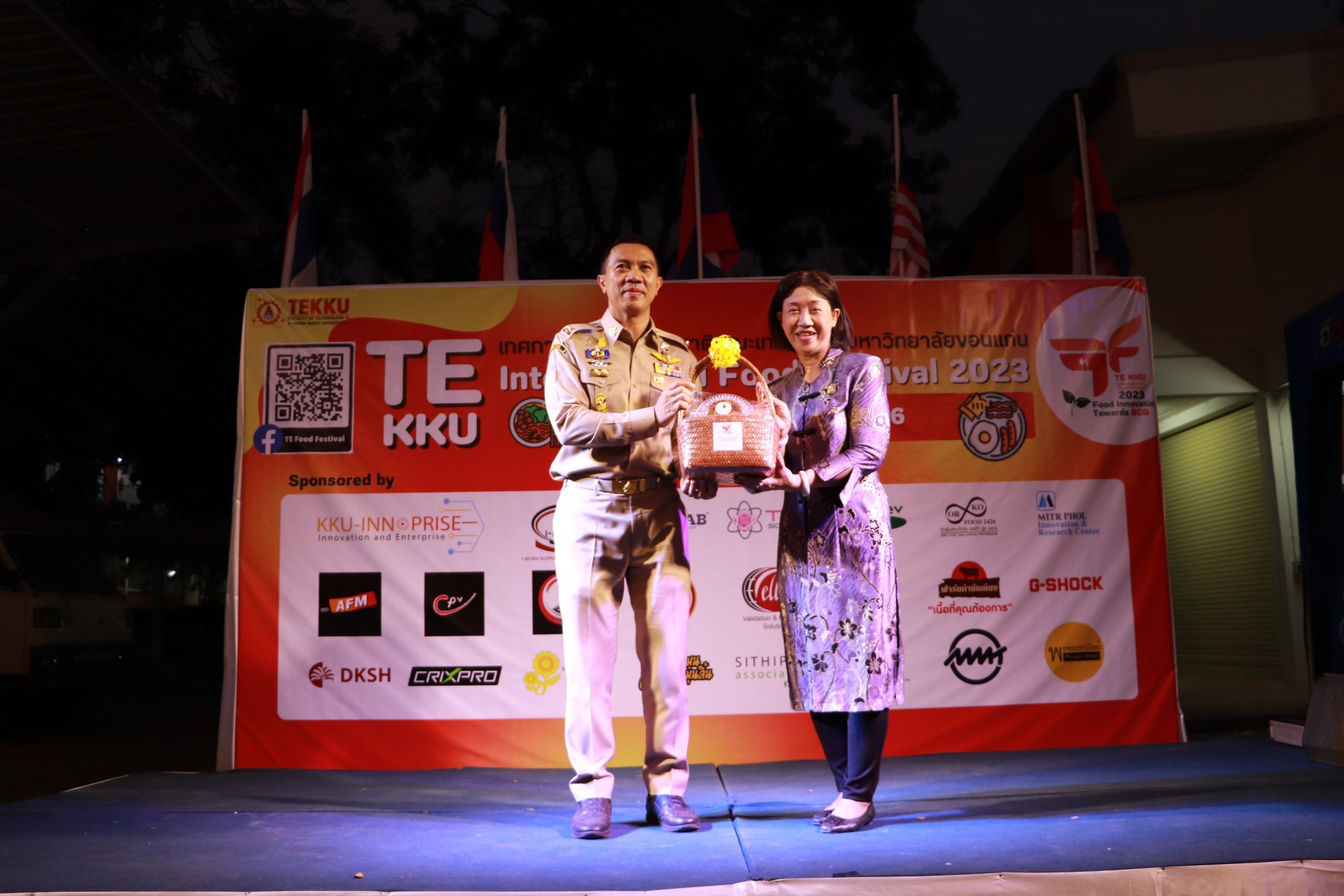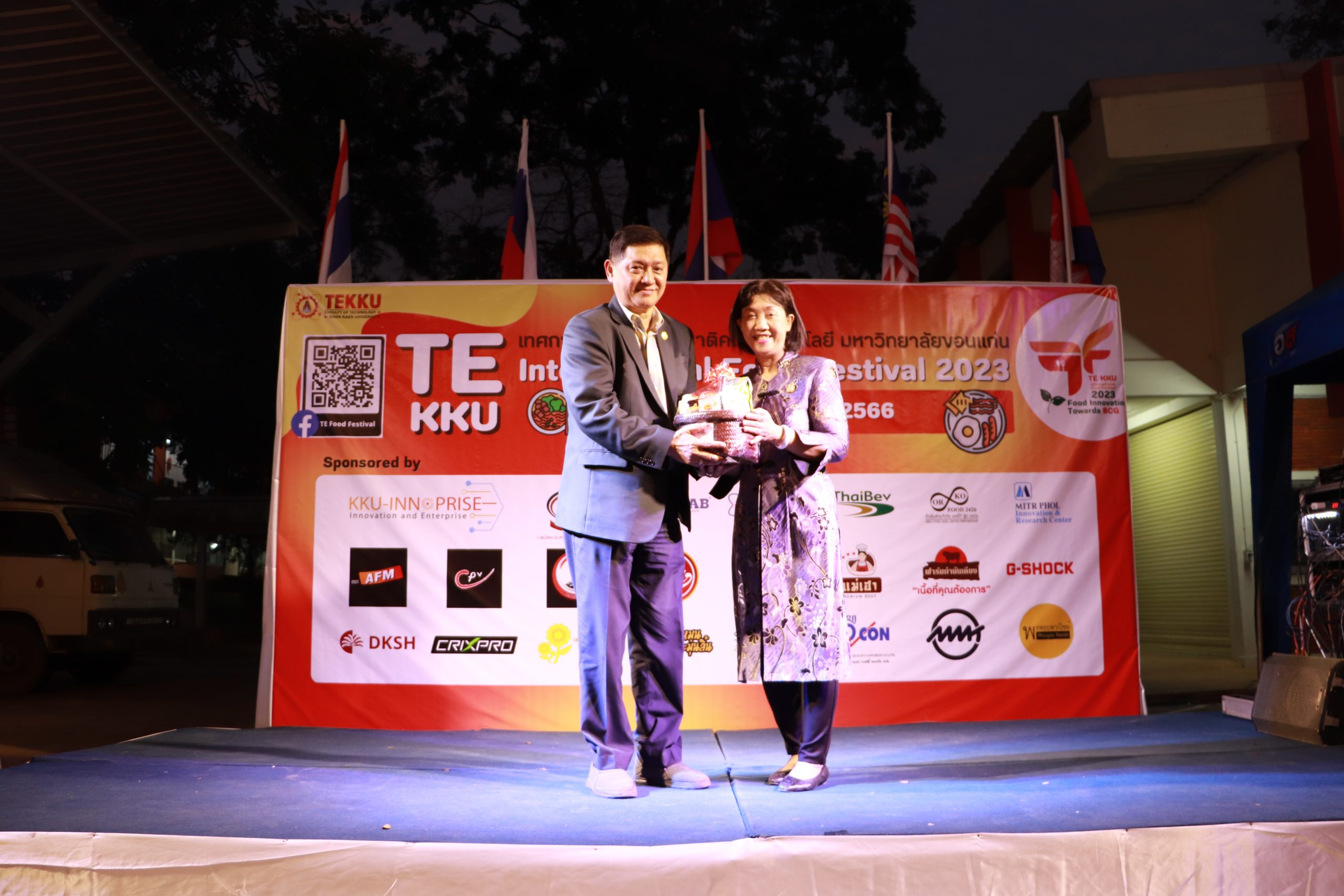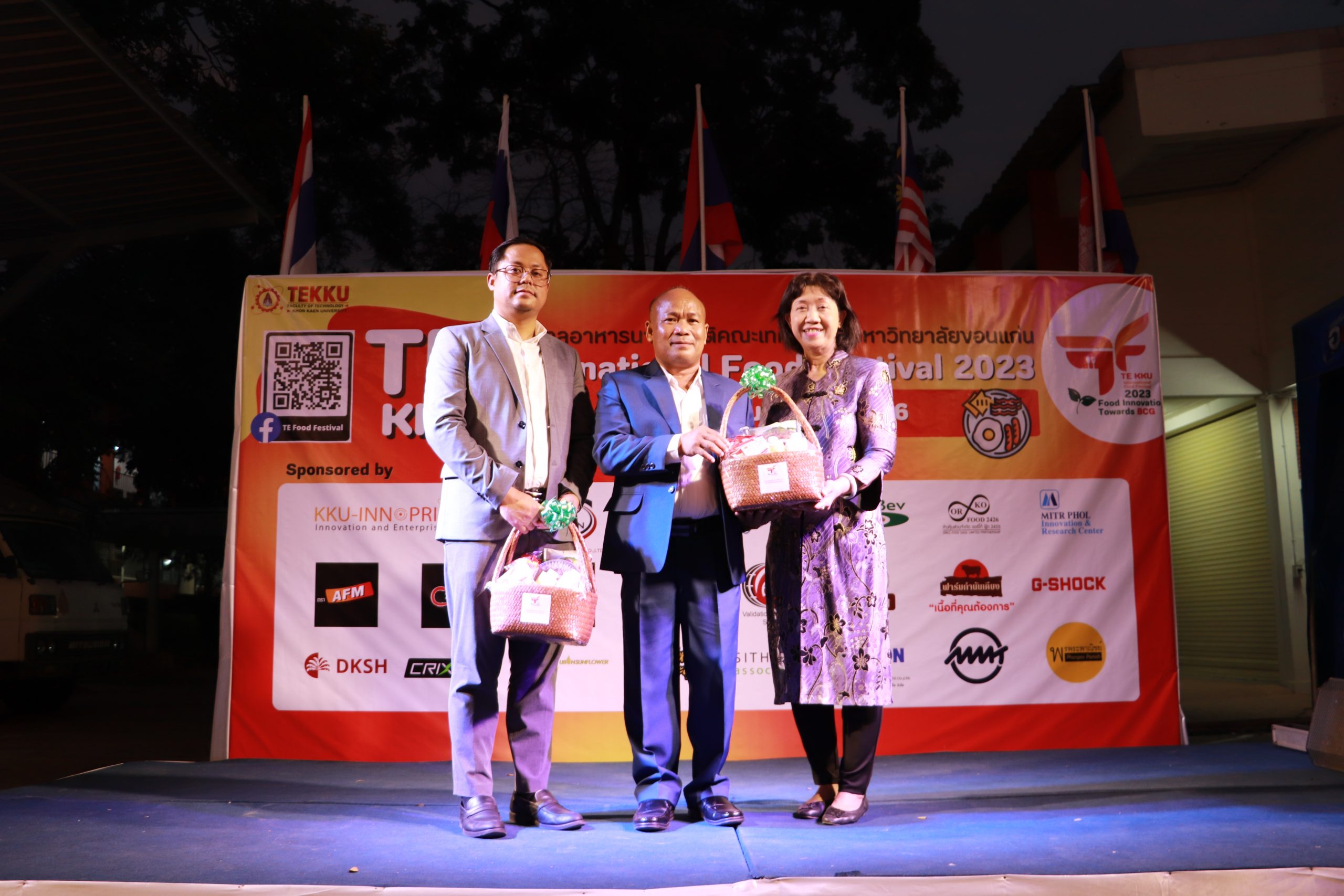 โดย ผศ.ดร.อารยา เชาว์เรืองฤทธิ์ คณบดีคณะเทคโนโลยี มข. ได้กล่าวรายงานการจัดงาน TE KKU Internationl Food Festival 2023 หลังจากนั้น รศ.นพ.ชาญชัย พานทองวิริยะกุล อธิการบดีมหาวิทยาลัยขอนแก่น ประธานในงานได้กล่าวเปิดงาน TE KKU Internationl Food Festival 2023 จากนั้นได้ให้เกียรติถ่ายภาพและมอบกระเช้าแสดงความขอบคุณกับผู้สนับสนุนและศิษย์เก่าคณะเทคโนโลยี ร่วมให้การสนับสนุนในการจัดงาน TE KKU Internationl Food Festival 2023