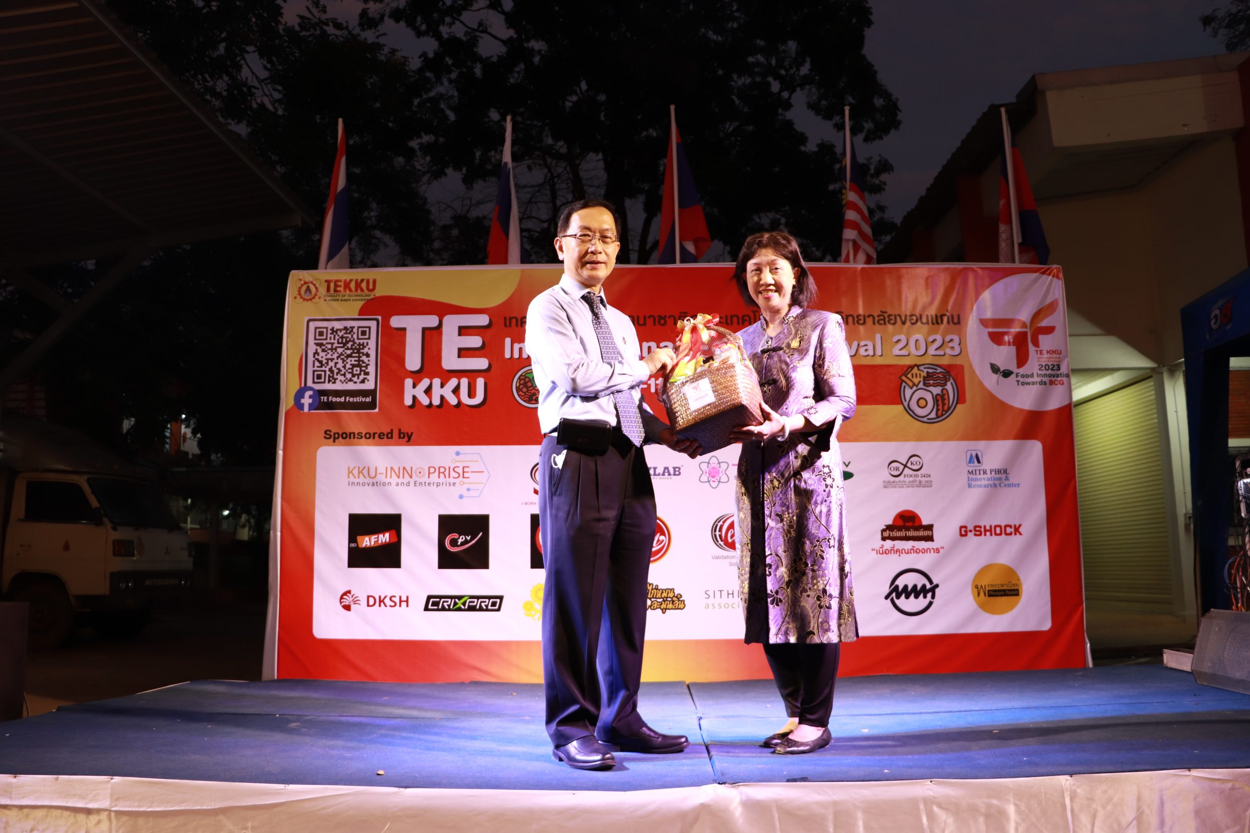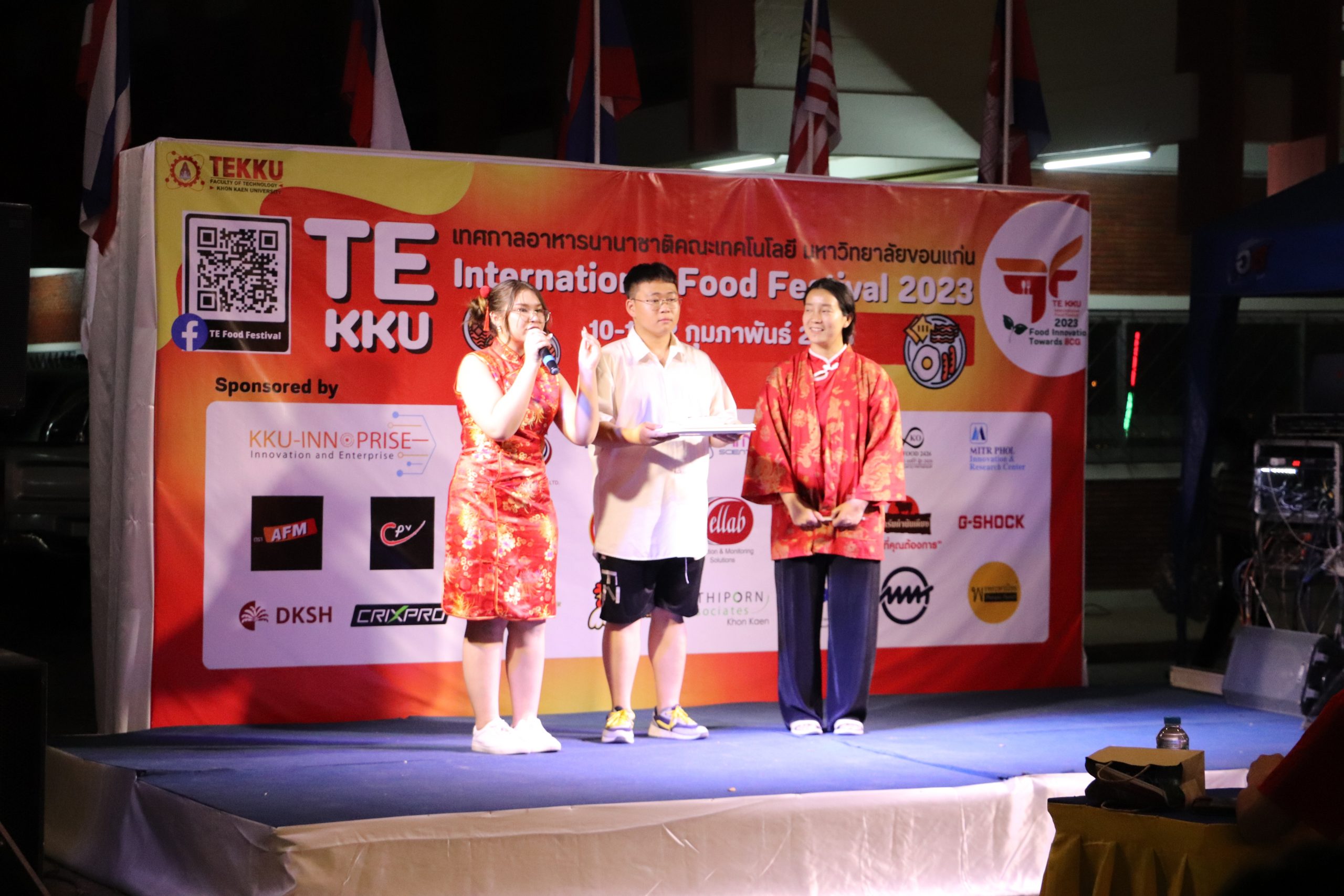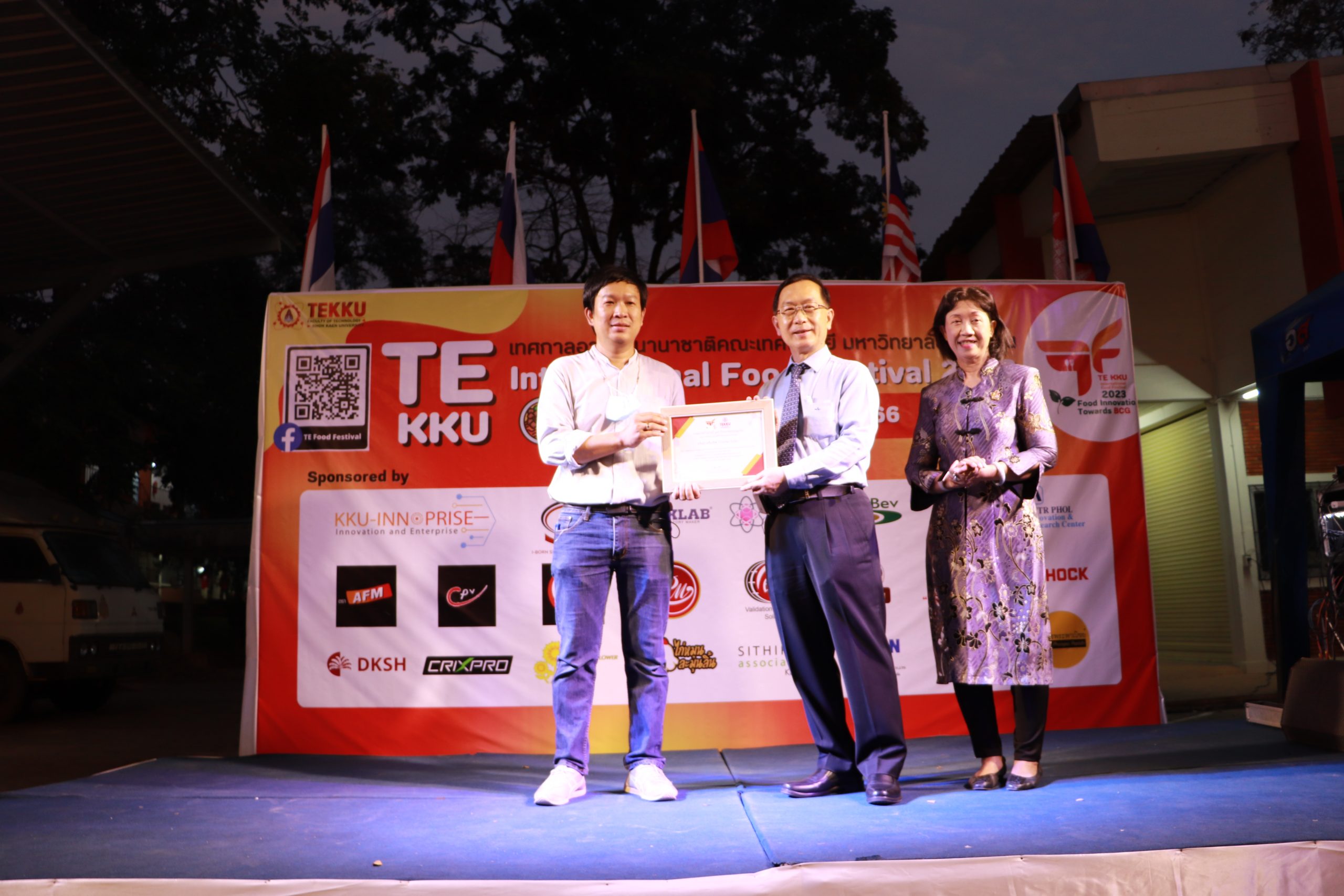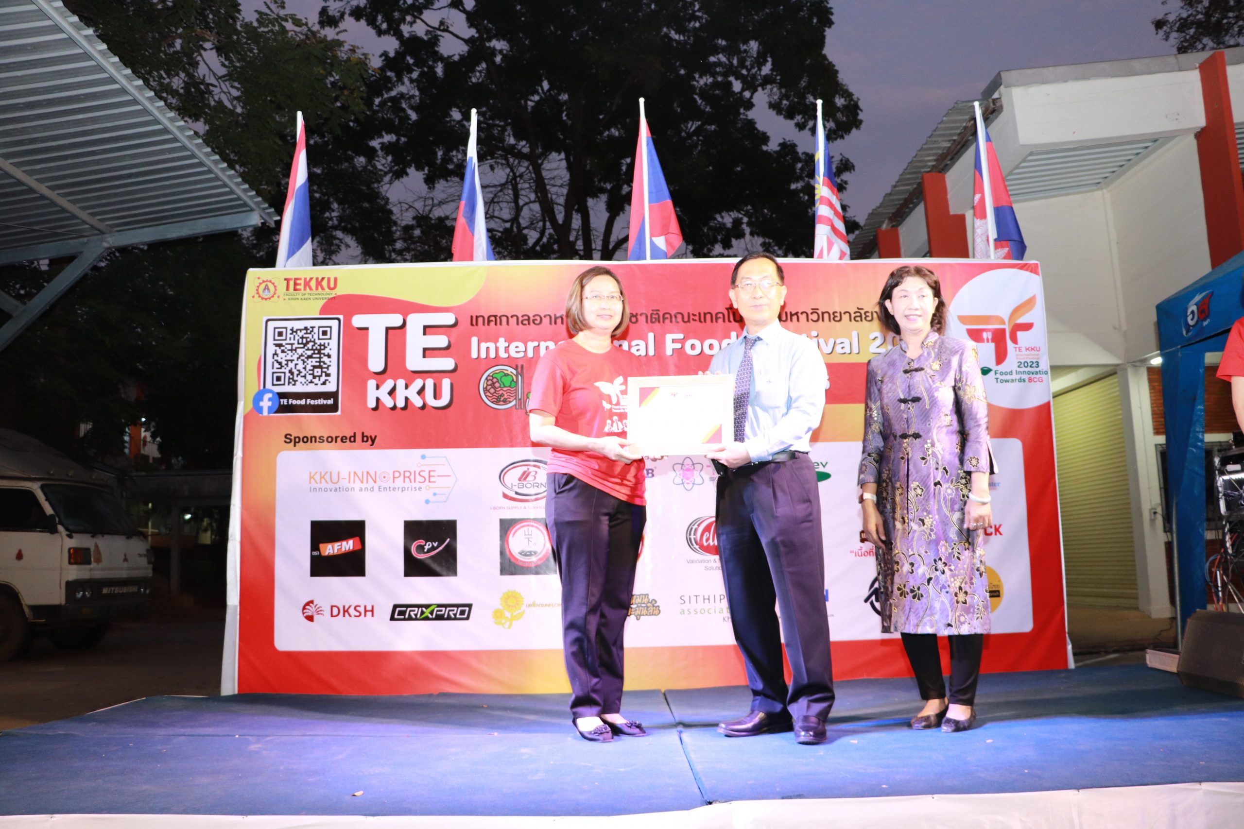 โดย ผศ.ดร.อารยา เชาว์เรืองฤทธิ์ คณบดีคณะเทคโนโลยี มข. ได้กล่าวรายงานการจัดงาน TE KKU Internationl Food Festival 2023 หลังจากนั้น รศ.นพ.ชาญชัย พานทองวิริยะกุล อธิการบดีมหาวิทยาลัยขอนแก่น ประธานในงานได้กล่าวเปิดงาน TE KKU Internationl Food Festival 2023 จากนั้นได้ให้เกียรติถ่ายภาพและมอบกระเช้าแสดงความขอบคุณกับผู้สนับสนุนและศิษย์เก่าคณะเทคโนโลยี ร่วมให้การสนับสนุนในการจัดงาน TE KKU Internationl Food Festival 2023