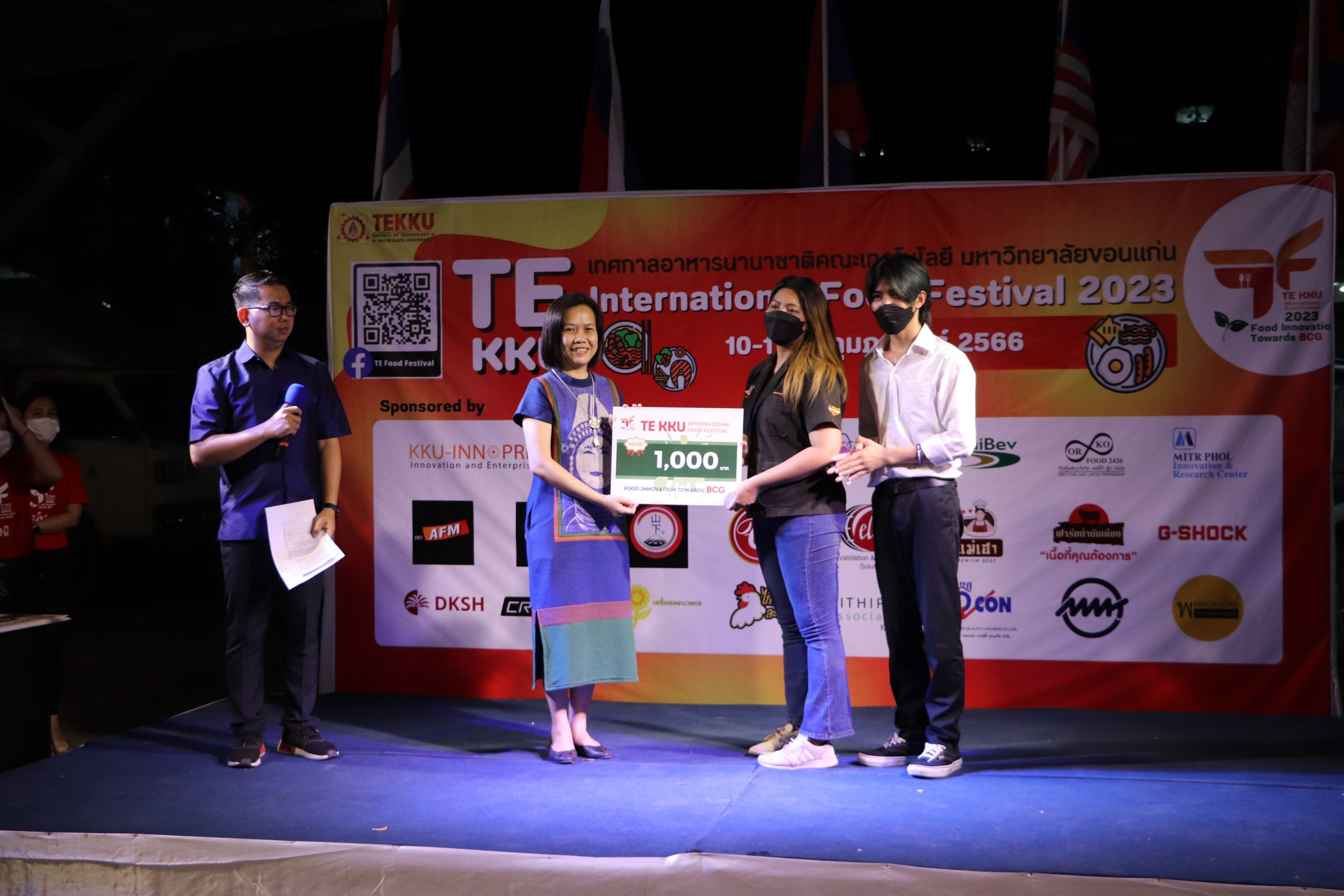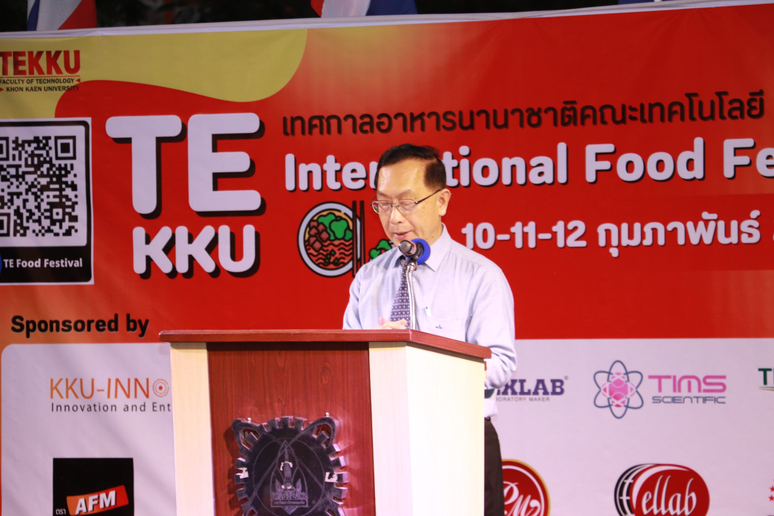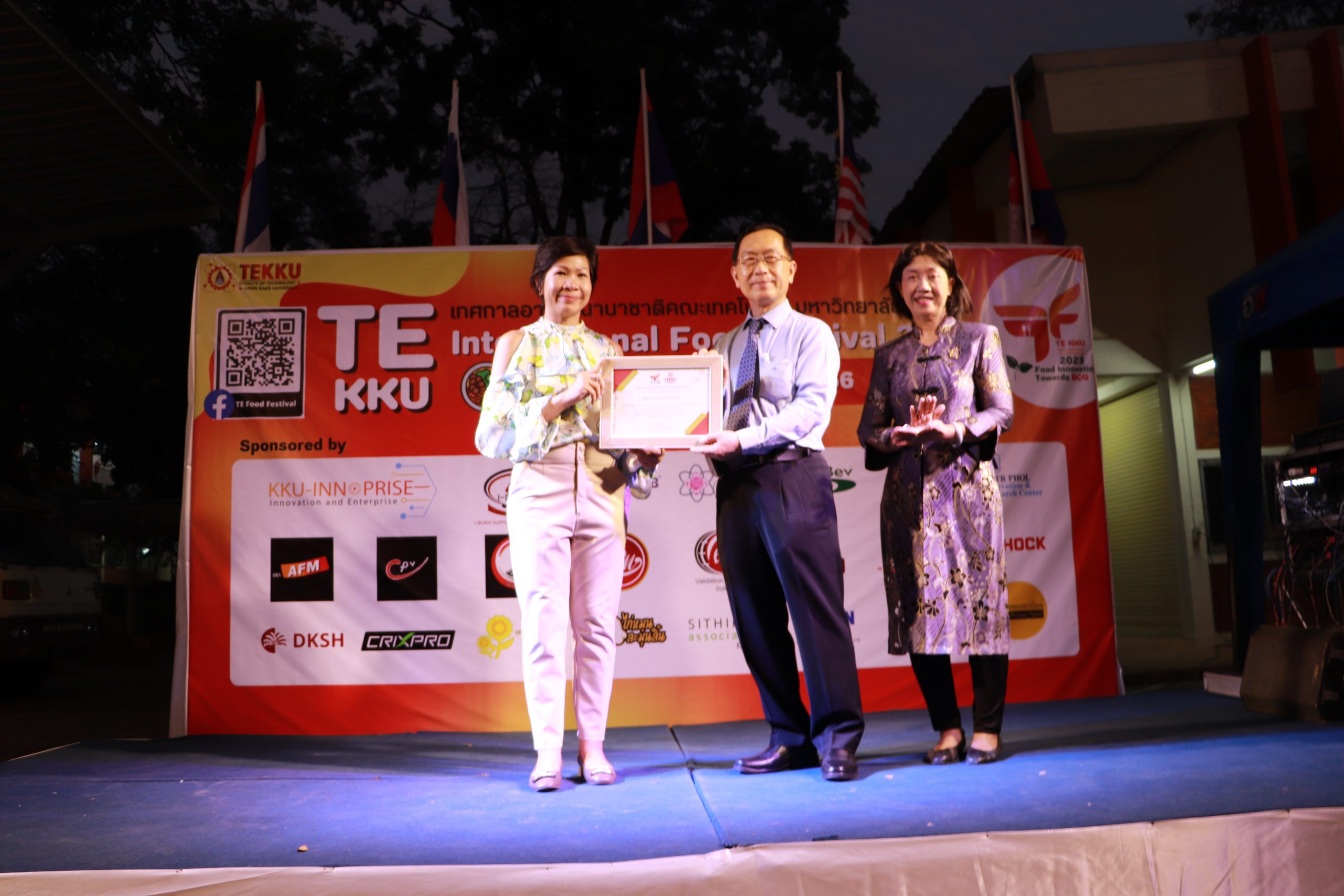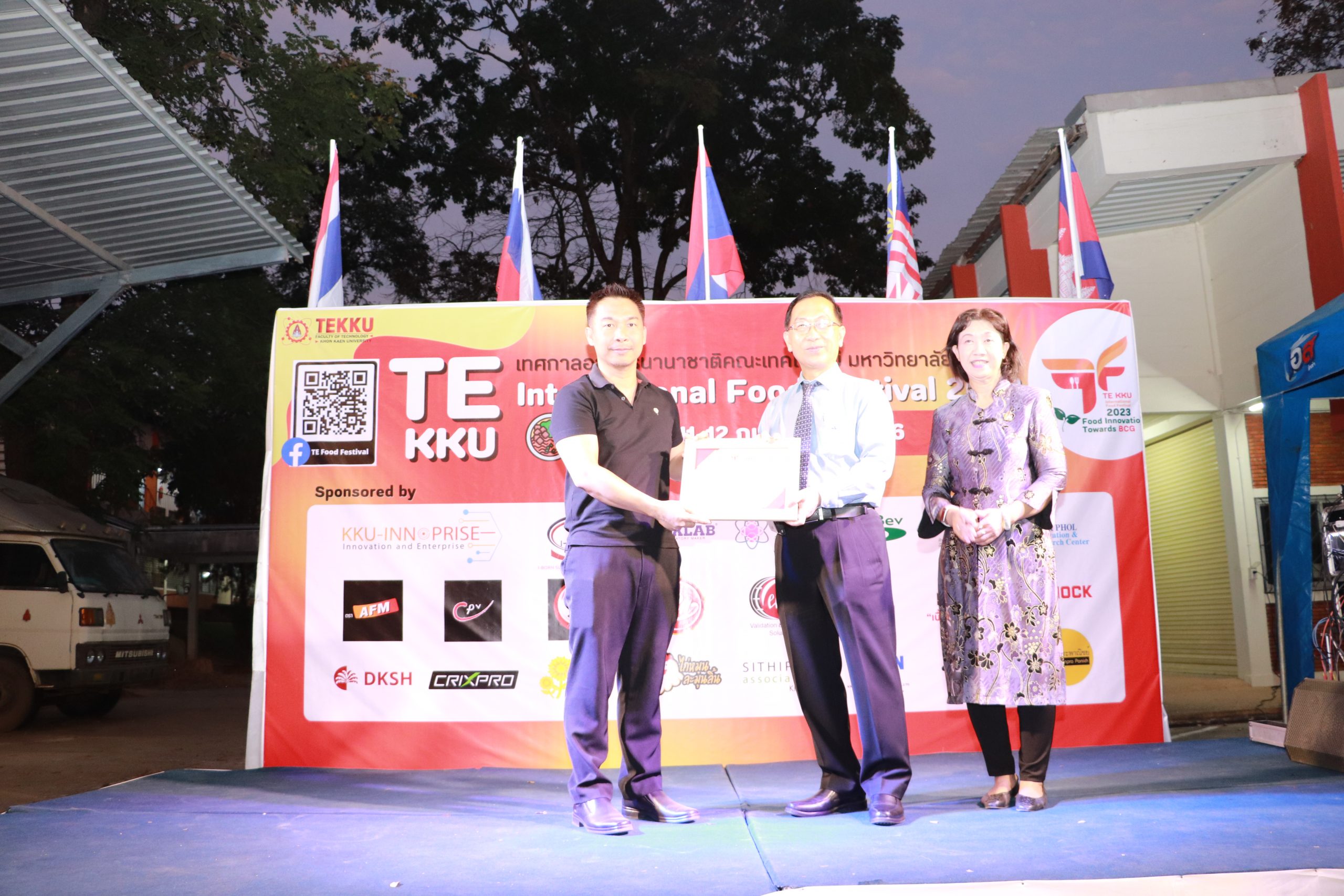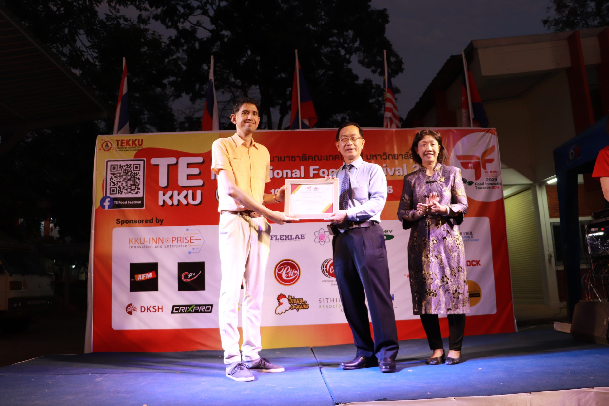 โดย ผศ.ดร.อารยา เชาว์เรืองฤทธิ์ คณบดีคณะเทคโนโลยี มข. ได้กล่าวรายงานการจัดงาน TE KKU Internationl Food Festival 2023 หลังจากนั้น รศ.นพ.ชาญชัย พานทองวิริยะกุล อธิการบดีมหาวิทยาลัยขอนแก่น ประธานในงานได้กล่าวเปิดงาน TE KKU Internationl Food Festival 2023 จากนั้นได้ให้เกียรติถ่ายภาพและมอบกระเช้าแสดงความขอบคุณกับผู้สนับสนุนและศิษย์เก่าคณะเทคโนโลยี ร่วมให้การสนับสนุนในการจัดงาน TE KKU Internationl Food Festival 2023