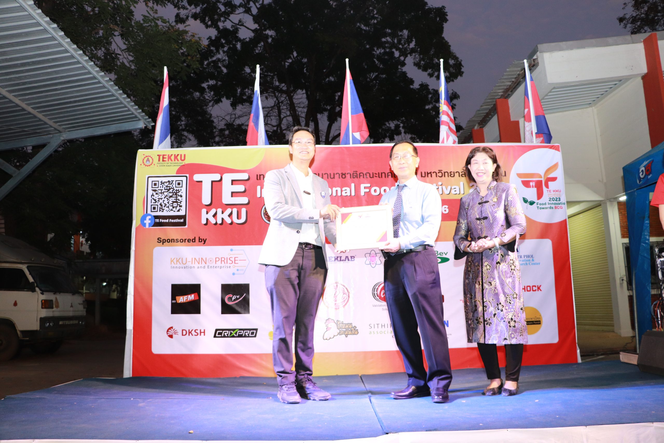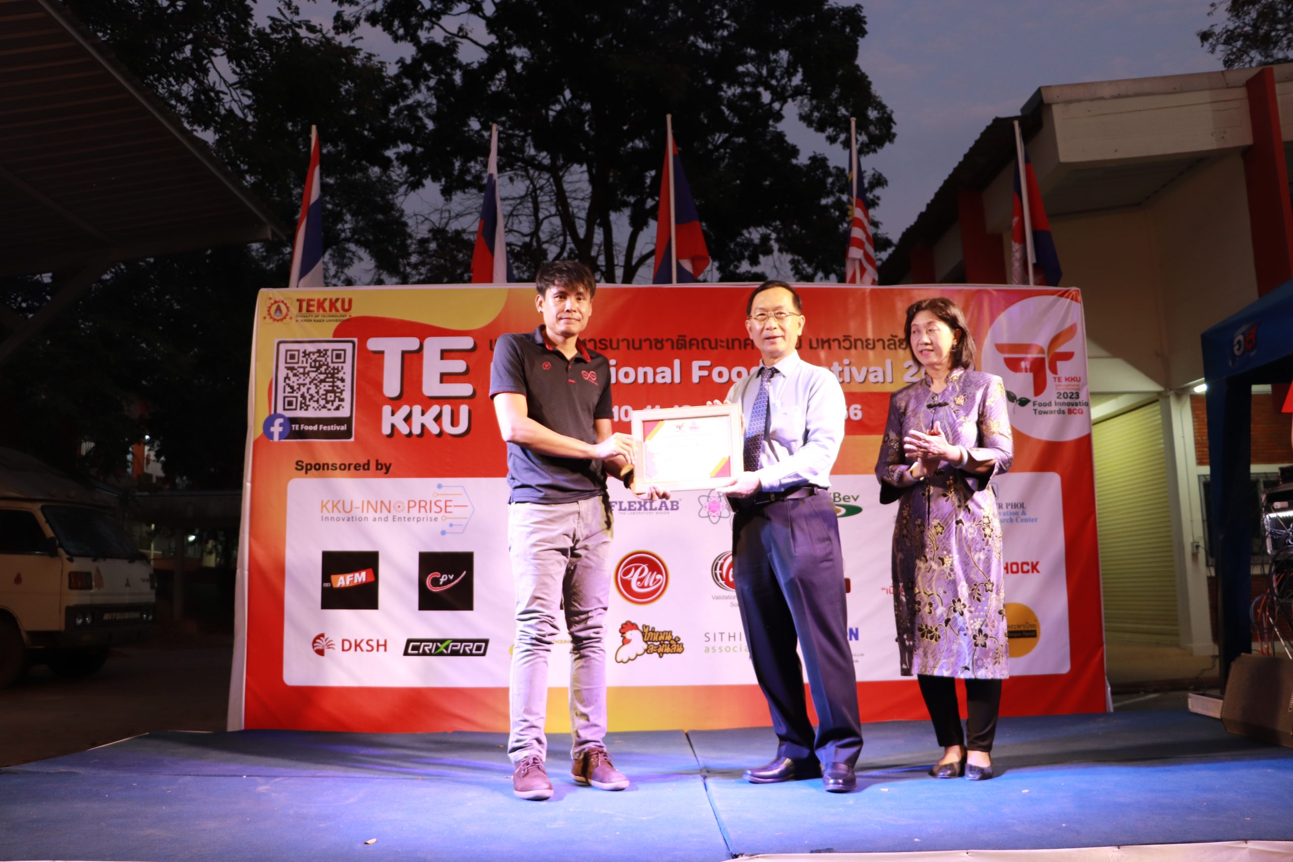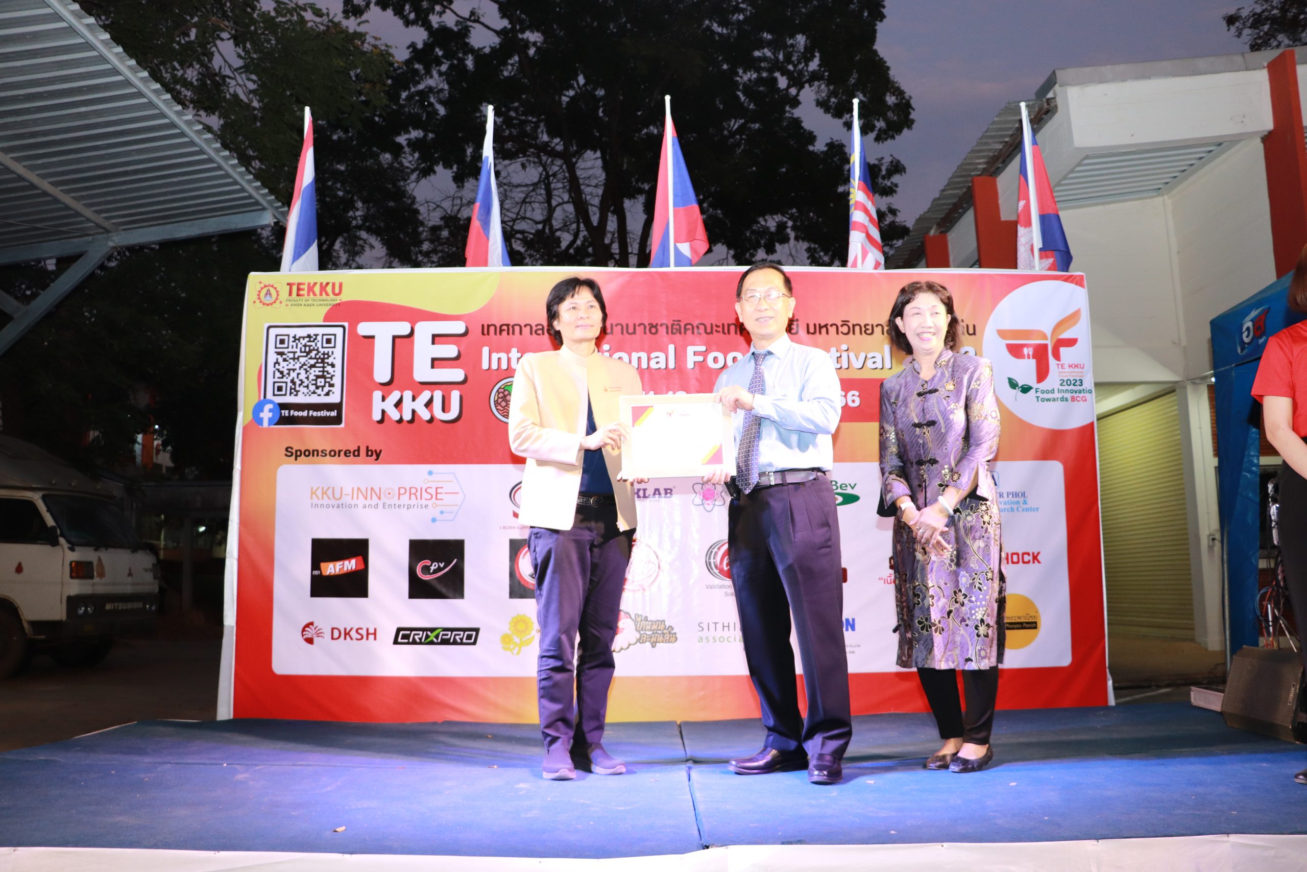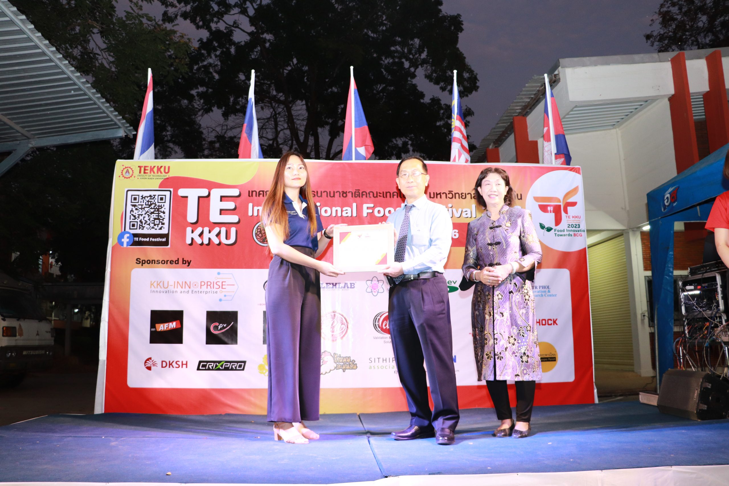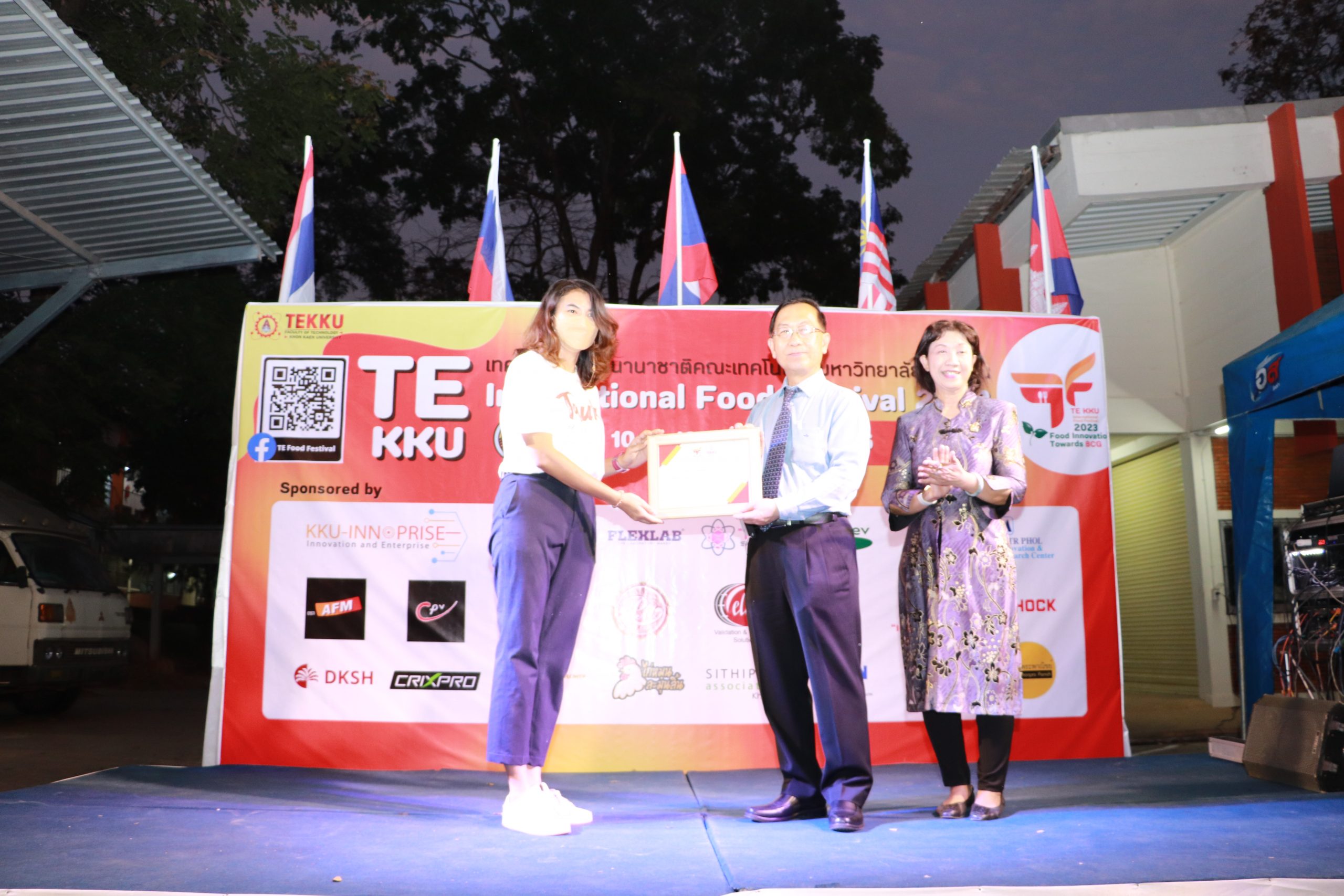 โดย ผศ.ดร.อารยา เชาว์เรืองฤทธิ์ คณบดีคณะเทคโนโลยี มข. ได้กล่าวรายงานการจัดงาน TE KKU Internationl Food Festival 2023 หลังจากนั้น รศ.นพ.ชาญชัย พานทองวิริยะกุล อธิการบดีมหาวิทยาลัยขอนแก่น ประธานในงานได้กล่าวเปิดงาน TE KKU Internationl Food Festival 2023 จากนั้นได้ให้เกียรติถ่ายภาพและมอบกระเช้าแสดงความขอบคุณกับผู้สนับสนุนและศิษย์เก่าคณะเทคโนโลยี ร่วมให้การสนับสนุนในการจัดงาน TE KKU Internationl Food Festival 2023