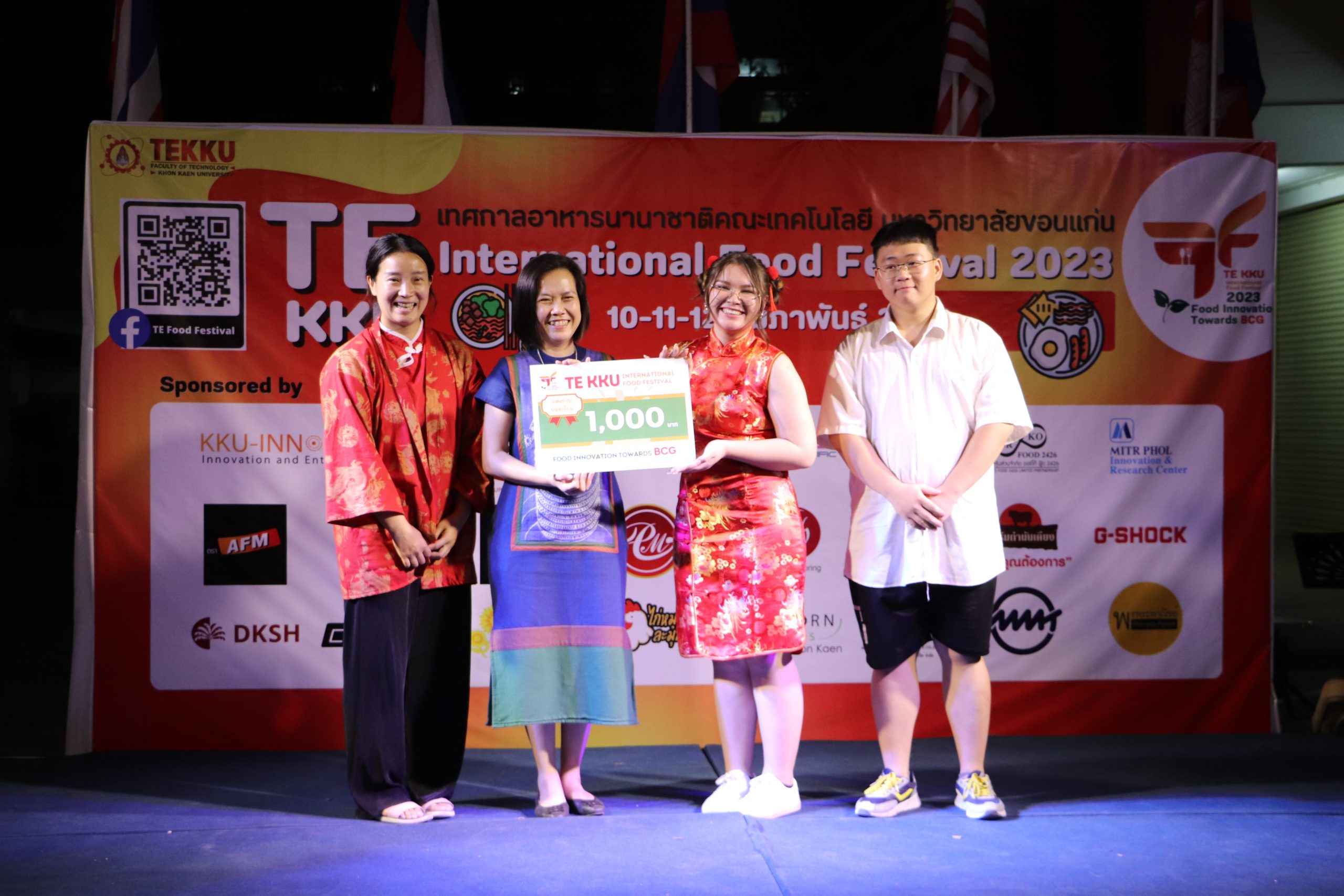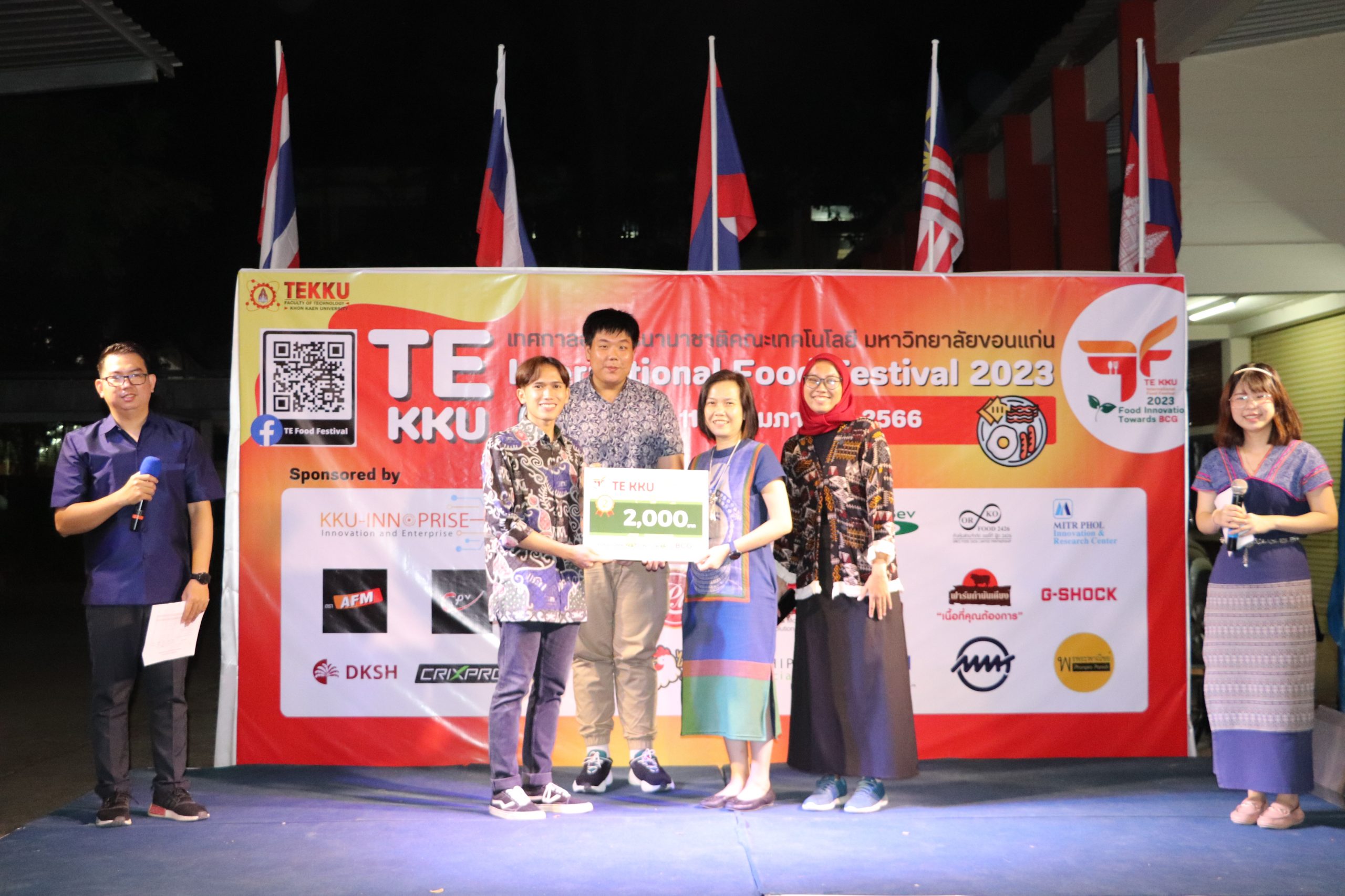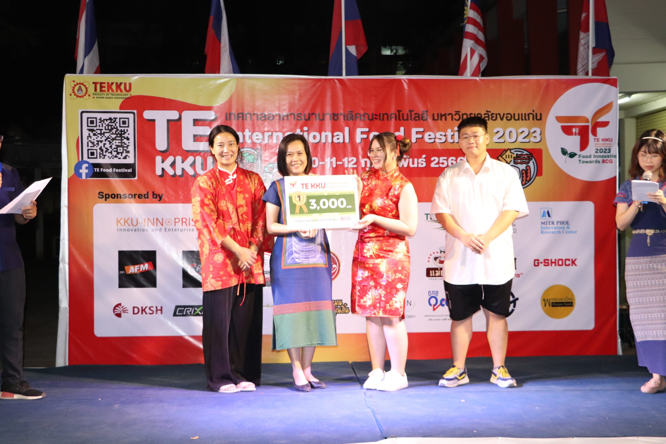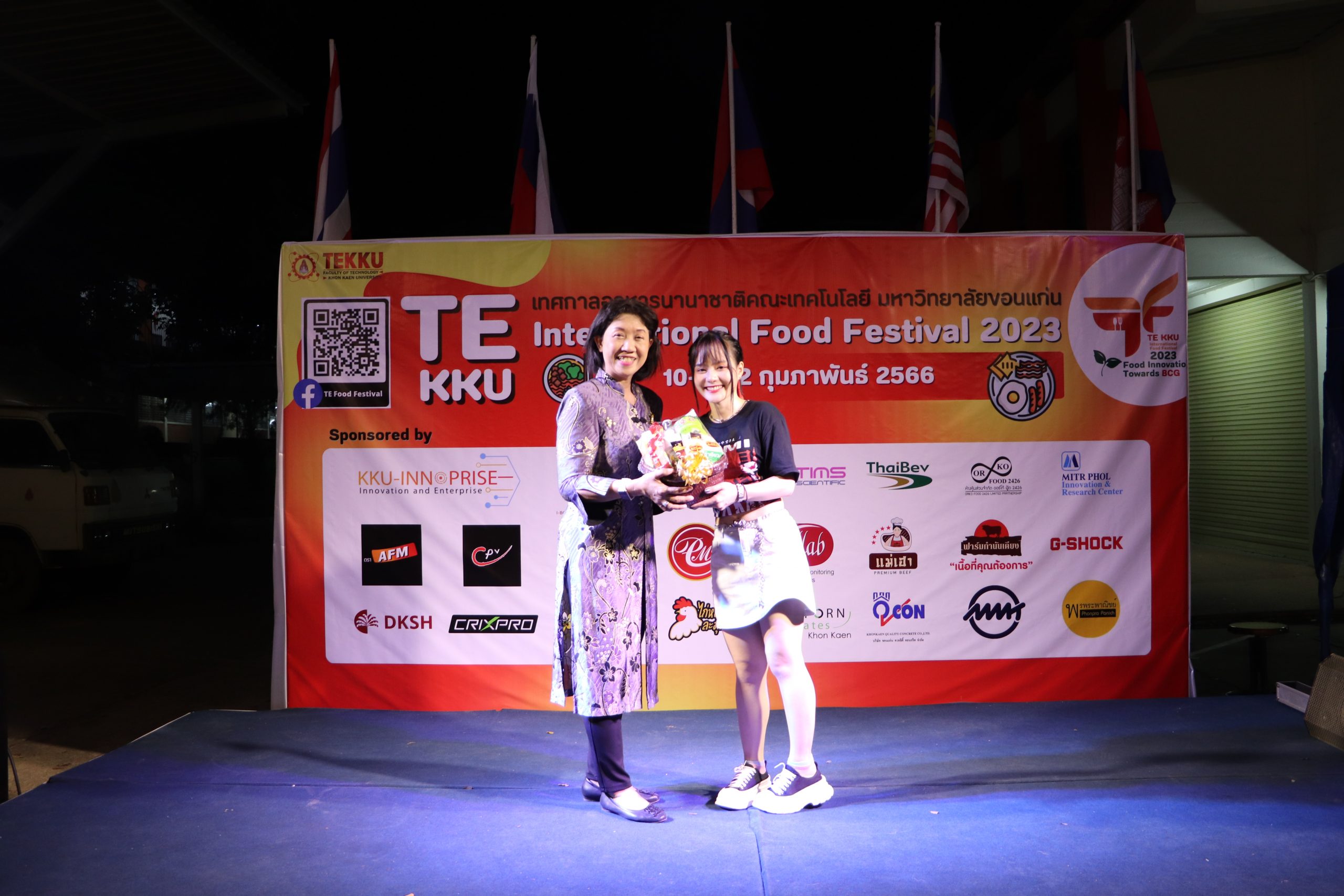 โดย ผศ.ดร.อารยา เชาว์เรืองฤทธิ์ คณบดีคณะเทคโนโลยี มข. ได้กล่าวรายงานการจัดงาน TE KKU Internationl Food Festival 2023 หลังจากนั้น รศ.นพ.ชาญชัย พานทองวิริยะกุล อธิการบดีมหาวิทยาลัยขอนแก่น ประธานในงานได้กล่าวเปิดงาน TE KKU Internationl Food Festival 2023 จากนั้นได้ให้เกียรติถ่ายภาพและมอบกระเช้าแสดงความขอบคุณกับผู้สนับสนุนและศิษย์เก่าคณะเทคโนโลยี ร่วมให้การสนับสนุนในการจัดงาน TE KKU Internationl Food Festival 2023
