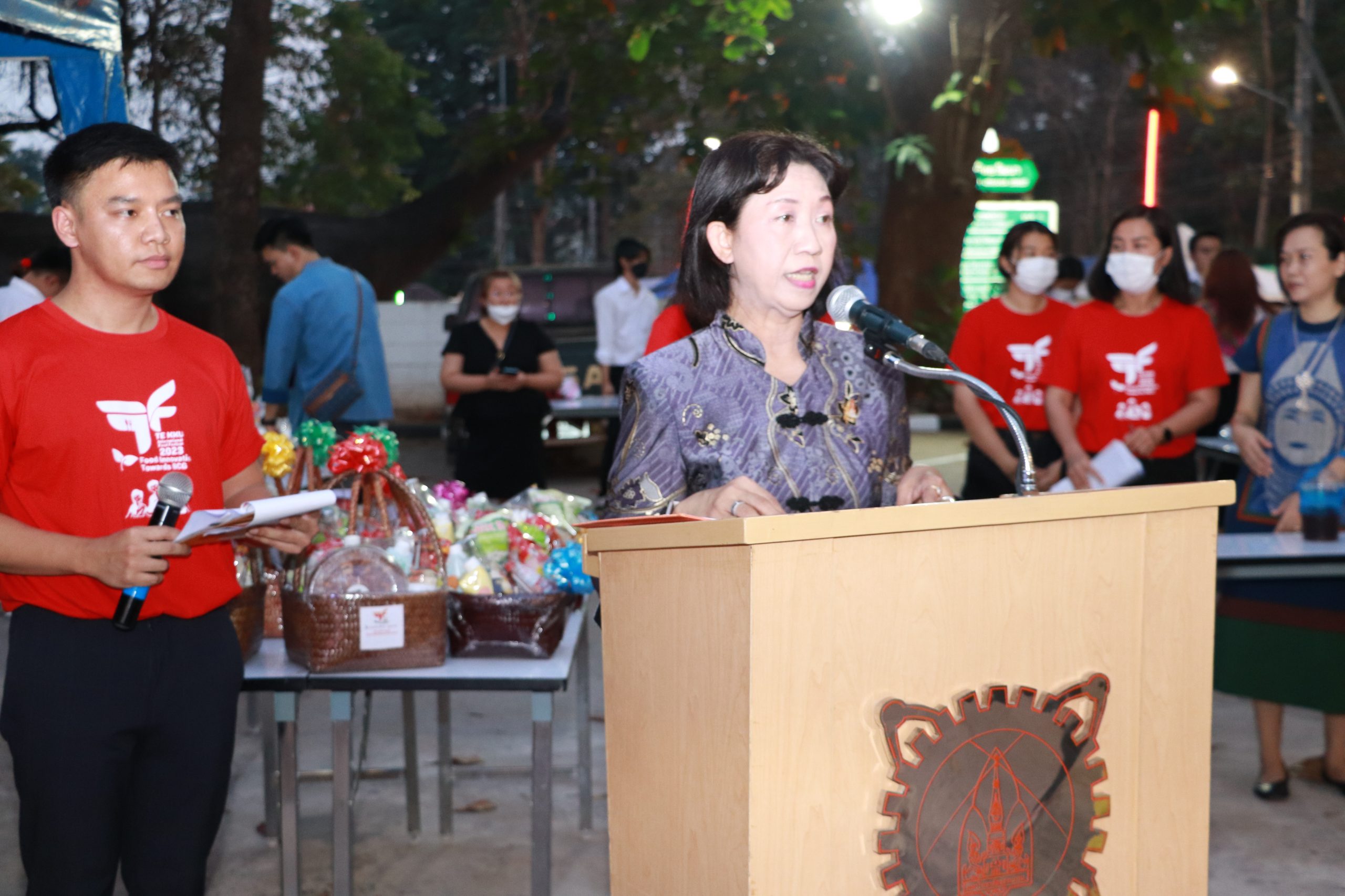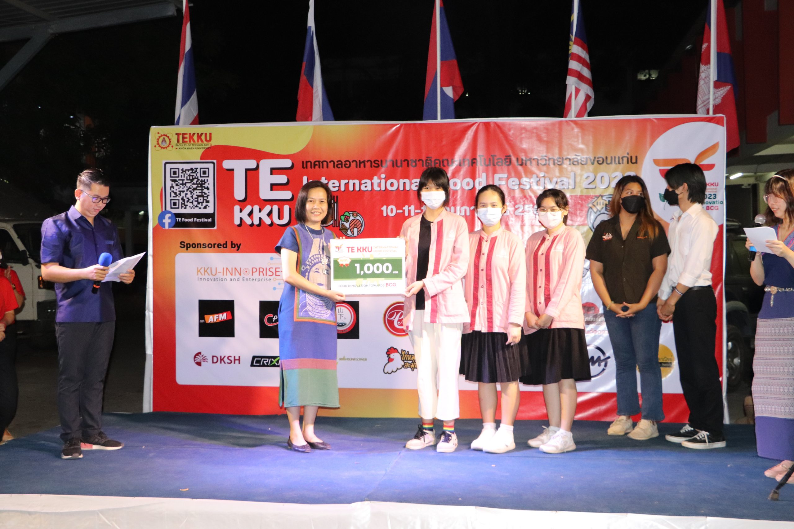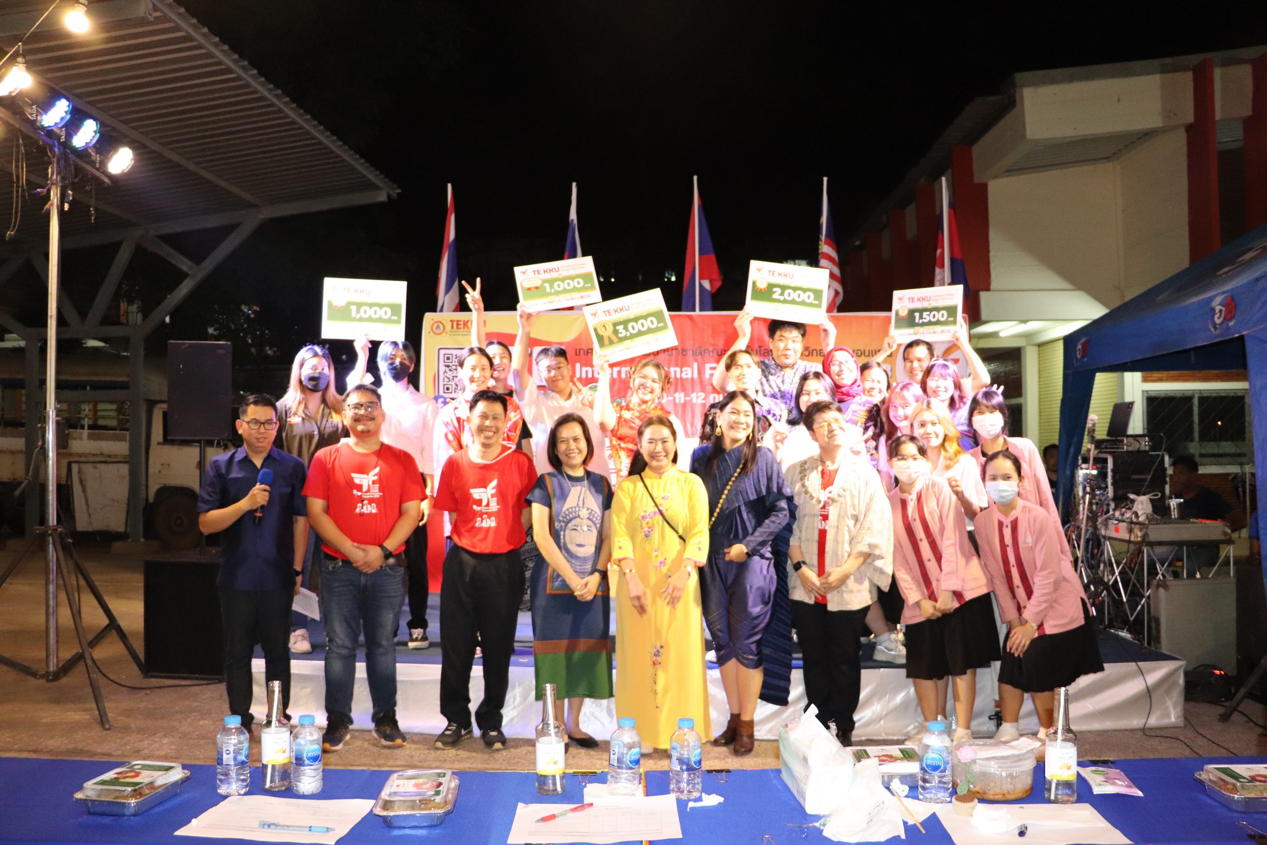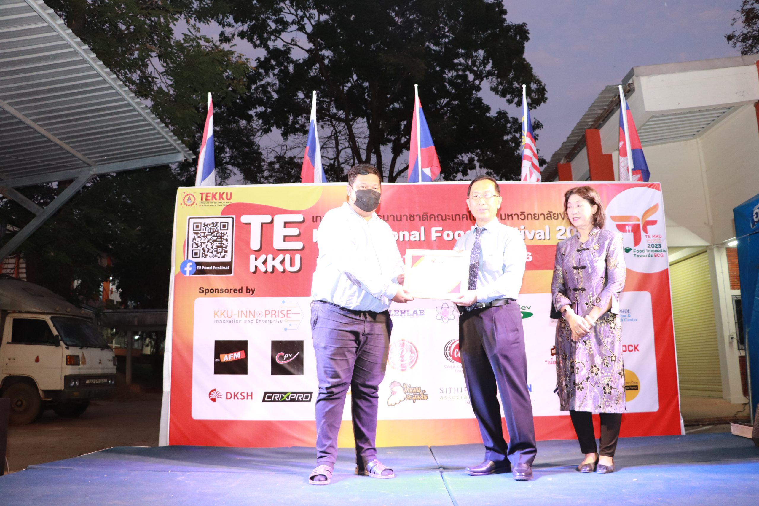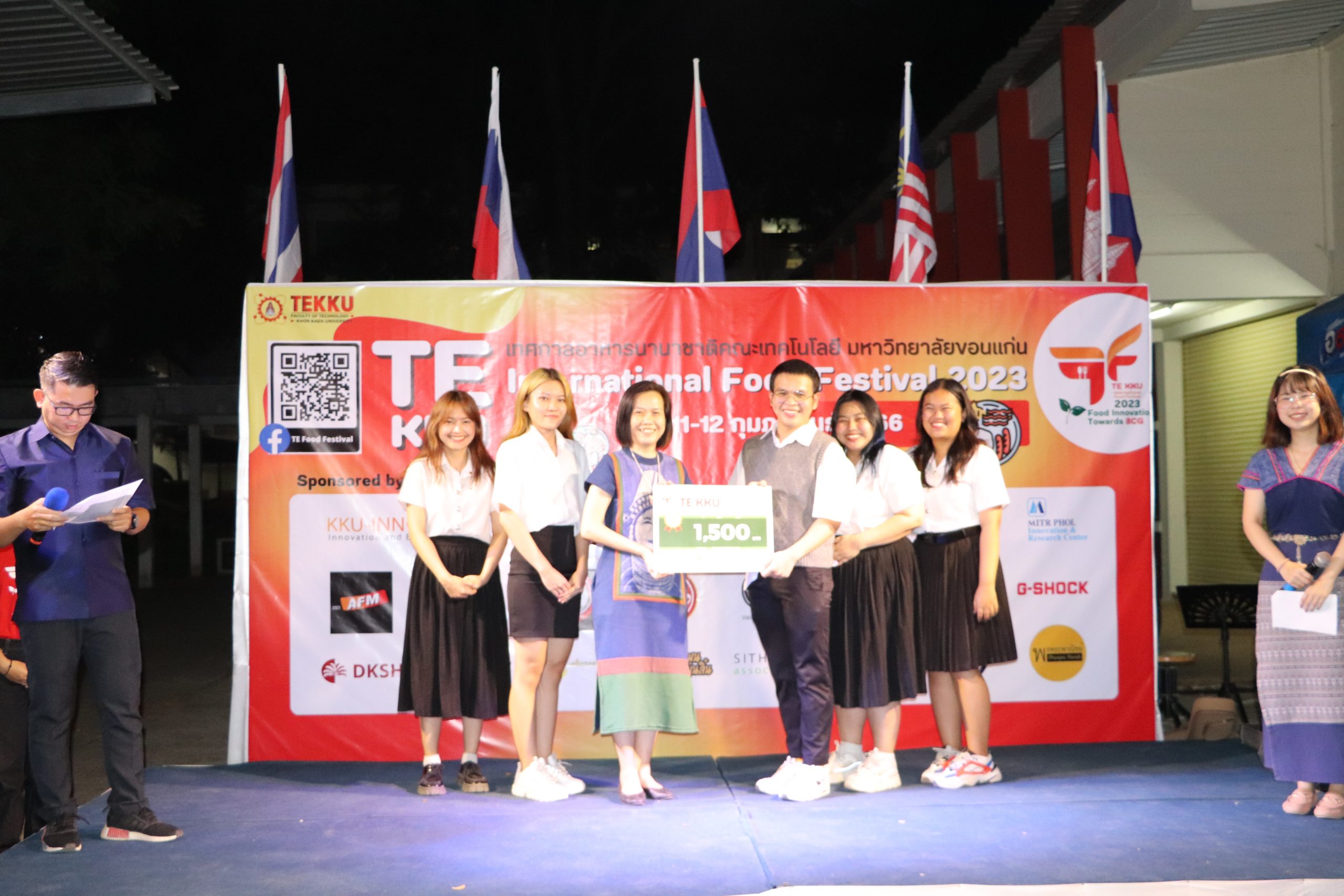 โดย ผศ.ดร.อารยา เชาว์เรืองฤทธิ์ คณบดีคณะเทคโนโลยี มข. ได้กล่าวรายงานการจัดงาน TE KKU Internationl Food Festival 2023 หลังจากนั้น รศ.นพ.ชาญชัย พานทองวิริยะกุล อธิการบดีมหาวิทยาลัยขอนแก่น ประธานในงานได้กล่าวเปิดงาน TE KKU Internationl Food Festival 2023 จากนั้นได้ให้เกียรติถ่ายภาพและมอบกระเช้าแสดงความขอบคุณกับผู้สนับสนุนและศิษย์เก่าคณะเทคโนโลยี ร่วมให้การสนับสนุนในการจัดงาน TE KKU Internationl Food Festival 2023