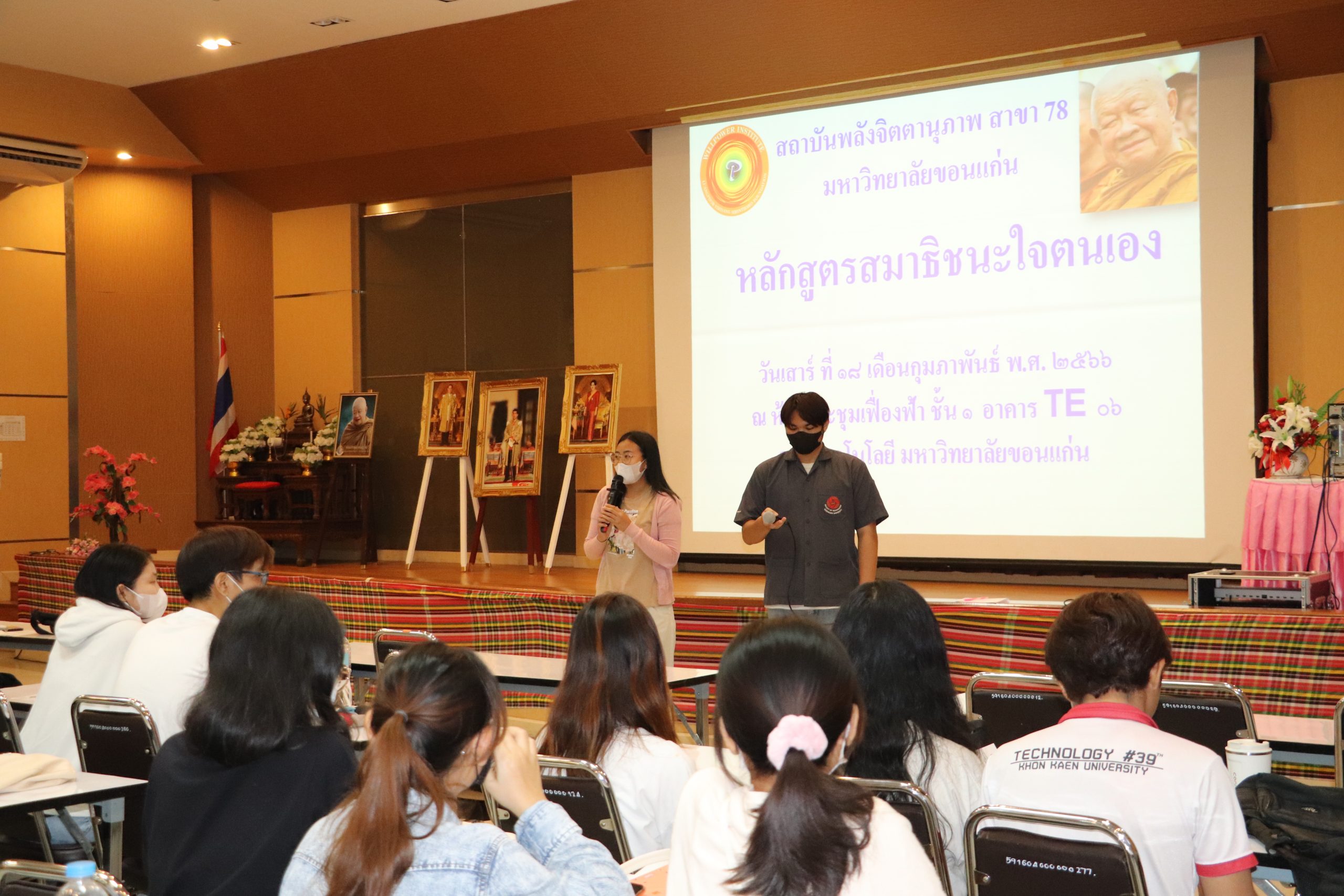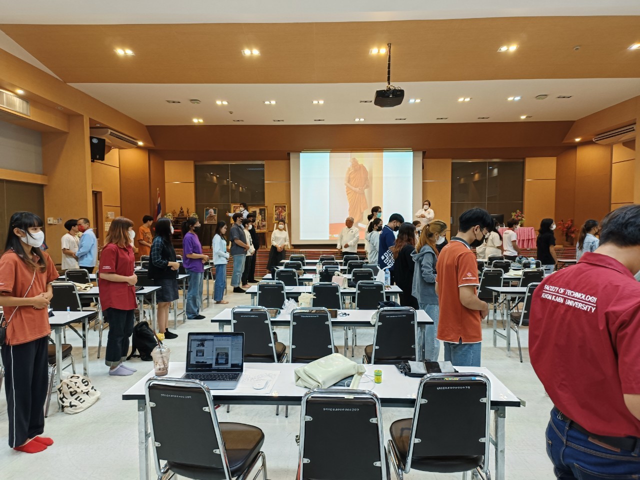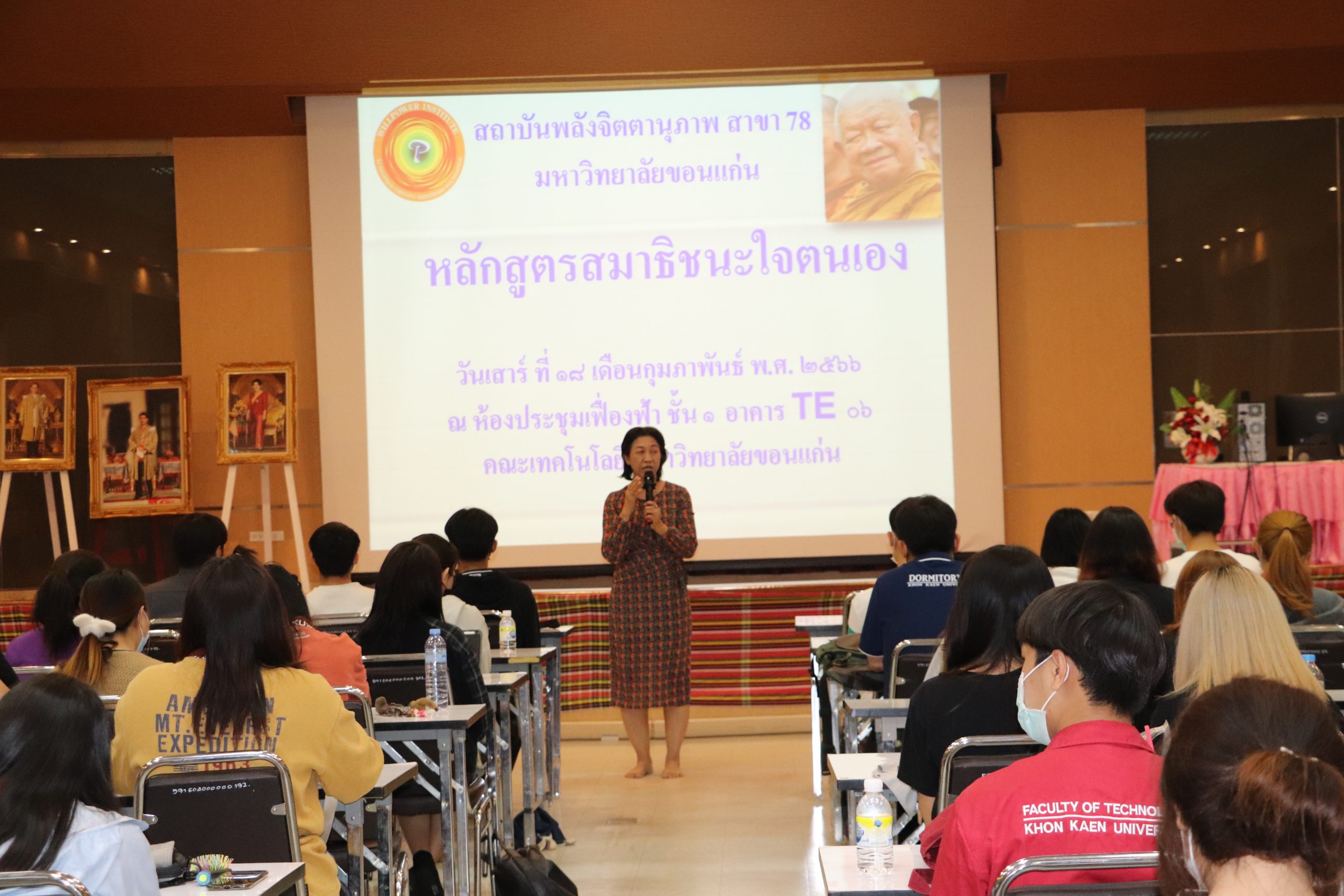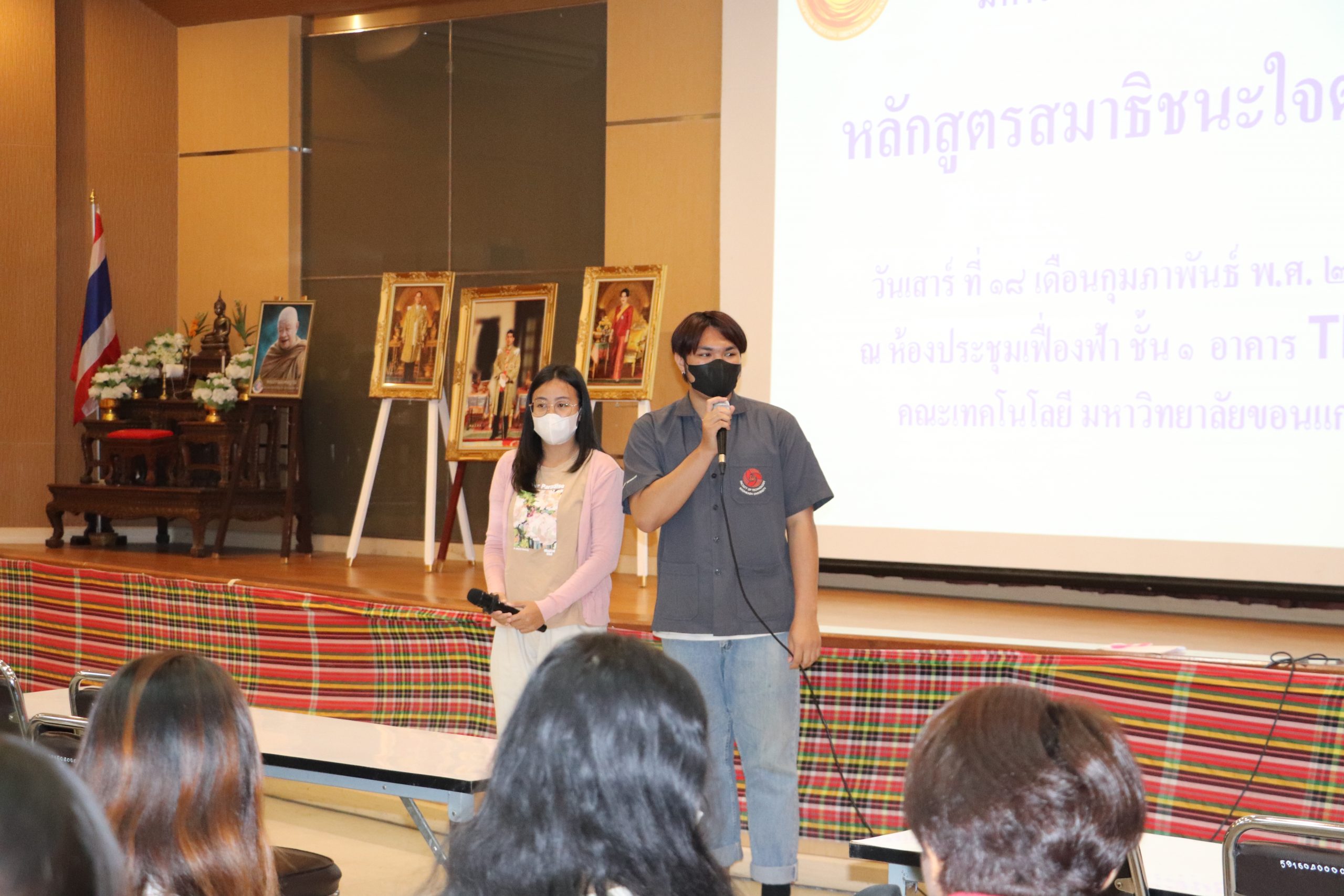 เมื่อวันเสาร์ที่ 18 กุมภาพันธ์ 2566 นำโดย ผศ.ดร.อารยา เชาวเรืองฤทธิ์ คณบดีคณะเทคโนโลยี มข. ผศ.นุศรา สุระโคตร รองคณบดีฝ่ายวิชาการ พัฒนานักศึกษาและศิษย์เก่าสัมพันธ์ และ คุณนภสร สิกขา หัวหน้างานสนับสนุนวิชาการ ได้จัดอบรมเพื่อพัฒนาทักษะด้านวิชาการสำหรับนักศึกษาคณะเทคโนโลยี มข. ประจำปีการศึกษา 2566 ในการนี้ได้รับเกียรติจากคณะครูสมาธิจากสถาบันพลังจิตตานุภาพ สาขา 78 มหาวิทยาลัยขอนแก่น อาจารย์จินตนา บุญจันทร์ อาจารย์อุมารินทร์ ตุลารักษ์ อาจารย์จิตภินันท์ ศรีจักรโคตร และ อาจารย์จันทร์หอม ทองนำ ได้ถ่ายทอดความรู้และการปฏิบัติสมาธิ การมีทักษะทางสังคม การรู้จักอารมณ์ตนเอง การควบคุมอารมณ์ การทำสมาธิมาเพื่อพัฒนาตนเอง การมีสมาธิมีสติเพื่อให้เกิดปัญญา เป็นผู้ที่มีความรับผิดชอบ รู้จักมีเหตุผล ทำให้เกิดมีความเมตตาขึ้น และประโยชน์ของสมาธิช่วยลดความเครียดส่งผลให้เกิดความสุข ของหลักสูตรสมาธิชนะใจตนเองให้กับนักศึกษาคณะเทคโนโลยี มข.
