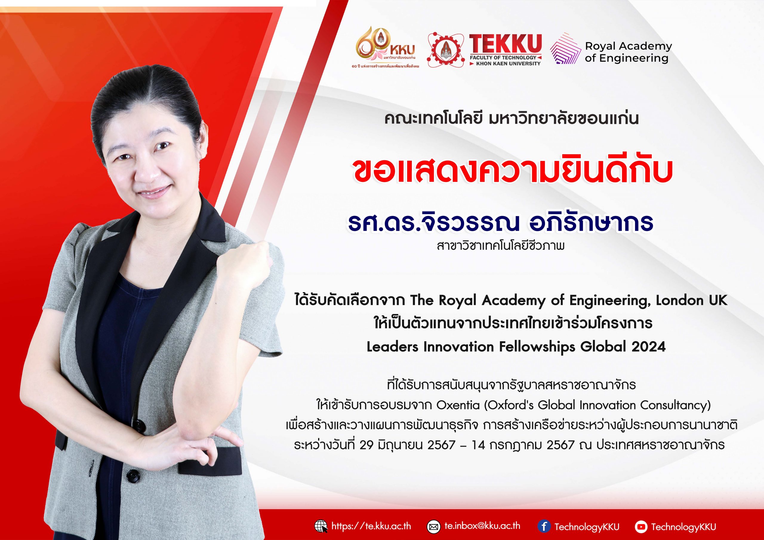 เนื่องในโอกาส ได้รับคัดเลือกจาก The Royal Academy of Engineering, London UK ให้เป็นตัวแทนจากประเทศไทยเข้าร่วมโครงการ Leaders Innovation Fellowships Global 2024 ที่ได้รับการสนับสนุนจากรัฐบาลสหราชอาณาจักร ให้เข้ารับการอบรมจาก Oxentia (Oxford’s Global Innovation Consultancy) เพื่อสร้างและวางแผนการพัฒนาธุรกิจ การสร้างเครือข่ายระหว่างผู้ประกอบการนานาชาติ ระหว่างวันที่ 29 มิถุนายน 2567 – 14 กรกฎาคม 2567 ณ ประเทศสหราชอาณาจักร