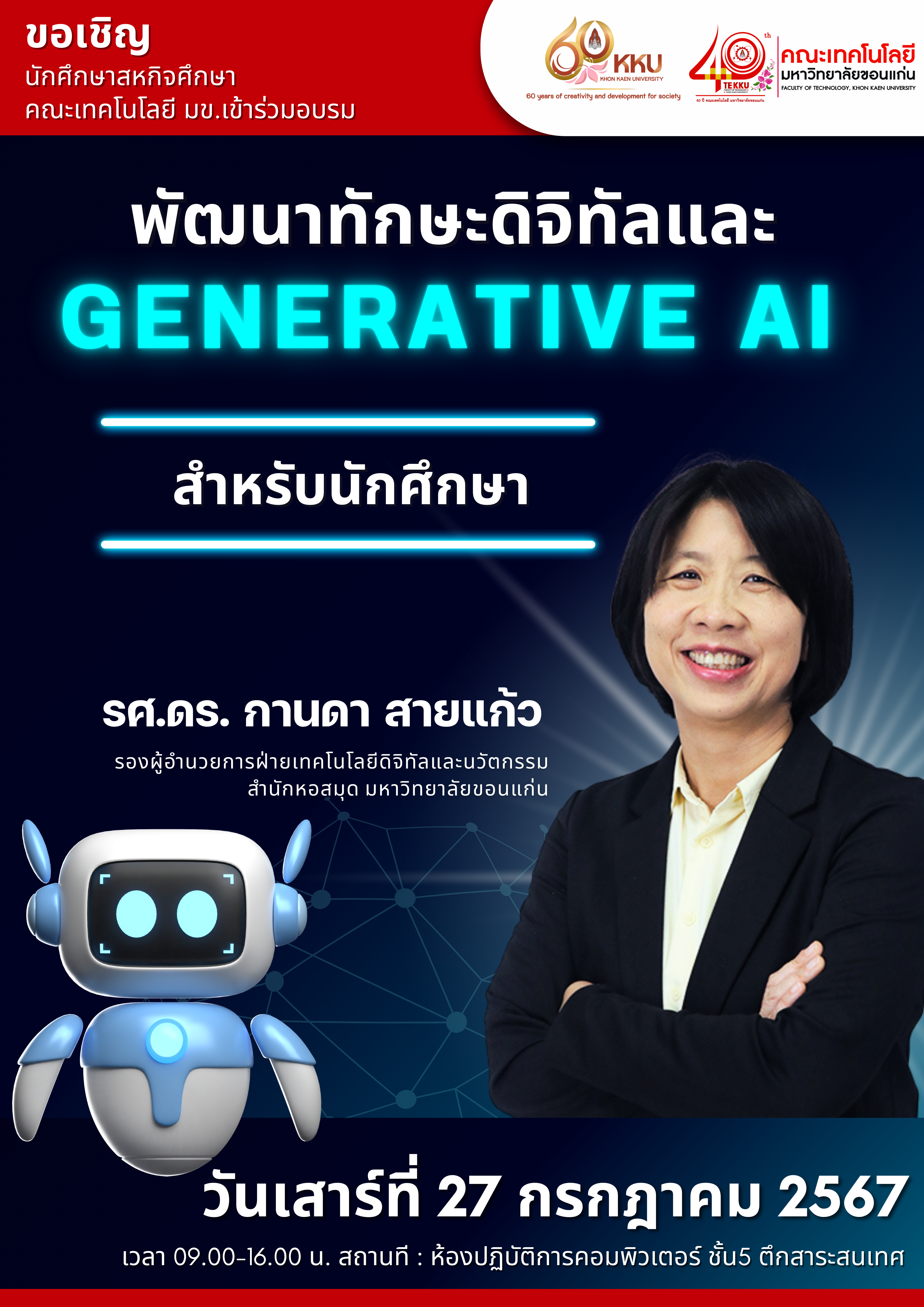 ขอเชิญนักศึกษาสหกิจศึกษาคณะเทคโนโลยี มข. ทุกท่าน เข้าร่วมอบรมฟรี ไม่มีค่าใช้จ่าย หัวข้ออบรม: พัฒนาทักษะดิจิทัลและ 𝐆𝐞𝐧𝐞𝐫𝐚𝐭𝐢𝐯𝐞 𝐀𝐈 สำหรับนักศึกษา วิทยากร: รศ.ดร. กานดา สายแก้ว รองผู้อำนวยการฝ่ายเทคโนโลยีดิจิทัลและนวัตกรรม สำนักหอสมุด มหาวิทยาลัยขอนแก่น วันเสาร์ที่ 27 กรกฎาคม 2567 เวลา 09.00-16.00 น. สถานที่: ห้องปฏิบัติการคอมพิวเตอร์ ชั้น 5 15 July 2024 Prateep Tewongsa ข่าวประชาสัมพันธ์ 26 ขอเชิญนักศึกษาสหกิจศึกษาคณะเทคโนโลยี มข. ทุกท่าน เข้าร่วมอบรมฟรี ไม่มีค่าใช้จ่าย หัวข้ออบรม: พัฒนาทักษะดิจิทัลและ 𝐆𝐞𝐧𝐞𝐫𝐚𝐭𝐢𝐯𝐞 𝐀𝐈 สำหรับนักศึกษา วิทยากร: รศ.ดร. กานดา สายแก้ว รองผู้อำนวยการฝ่ายเทคโนโลยีดิจิทัลและนวัตกรรม สำนักหอสมุด มหาวิทยาลัยขอนแก่น วันเสาร์ที่ 27 กรกฎาคม 2567 เวลา 09.00-16.00 น. สถานที่: ห้องปฏิบัติการคอมพิวเตอร์ ชั้น 5 อาคารศูนย์สารสนเทศ มหาวิทยาลัยขอนแก่น Prateep Tewongsa