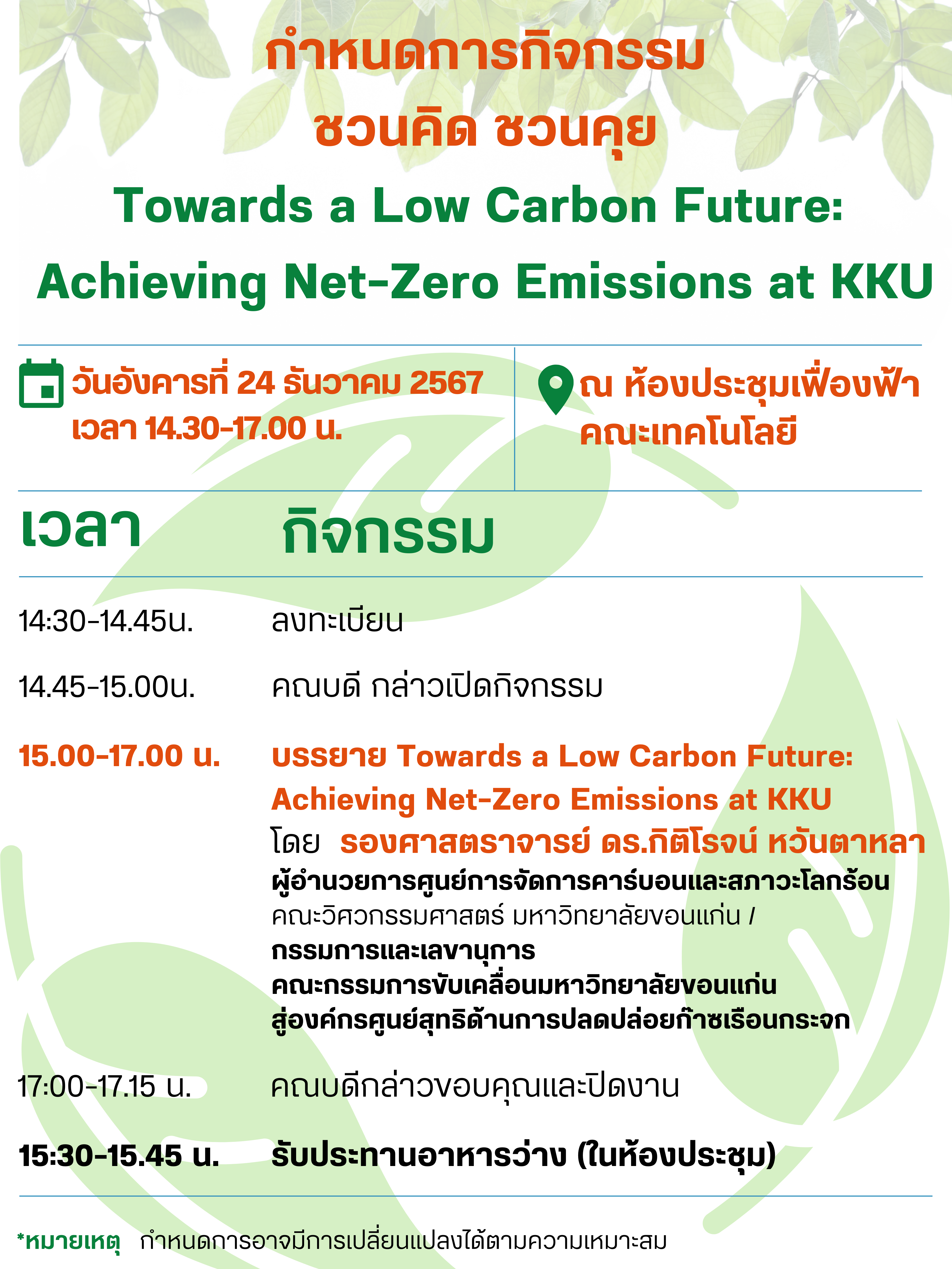 คณะเทคโนโลยี ขอเชิญชวนทุกท่านที่สนใจเข้าร่วมรับฟังการบรรยาย ในกิจกรรมชวนคิด ชวนคุย เรื่อง : Towards a Low Carbon Future: Achieving Net-Zero Emissions at KKU