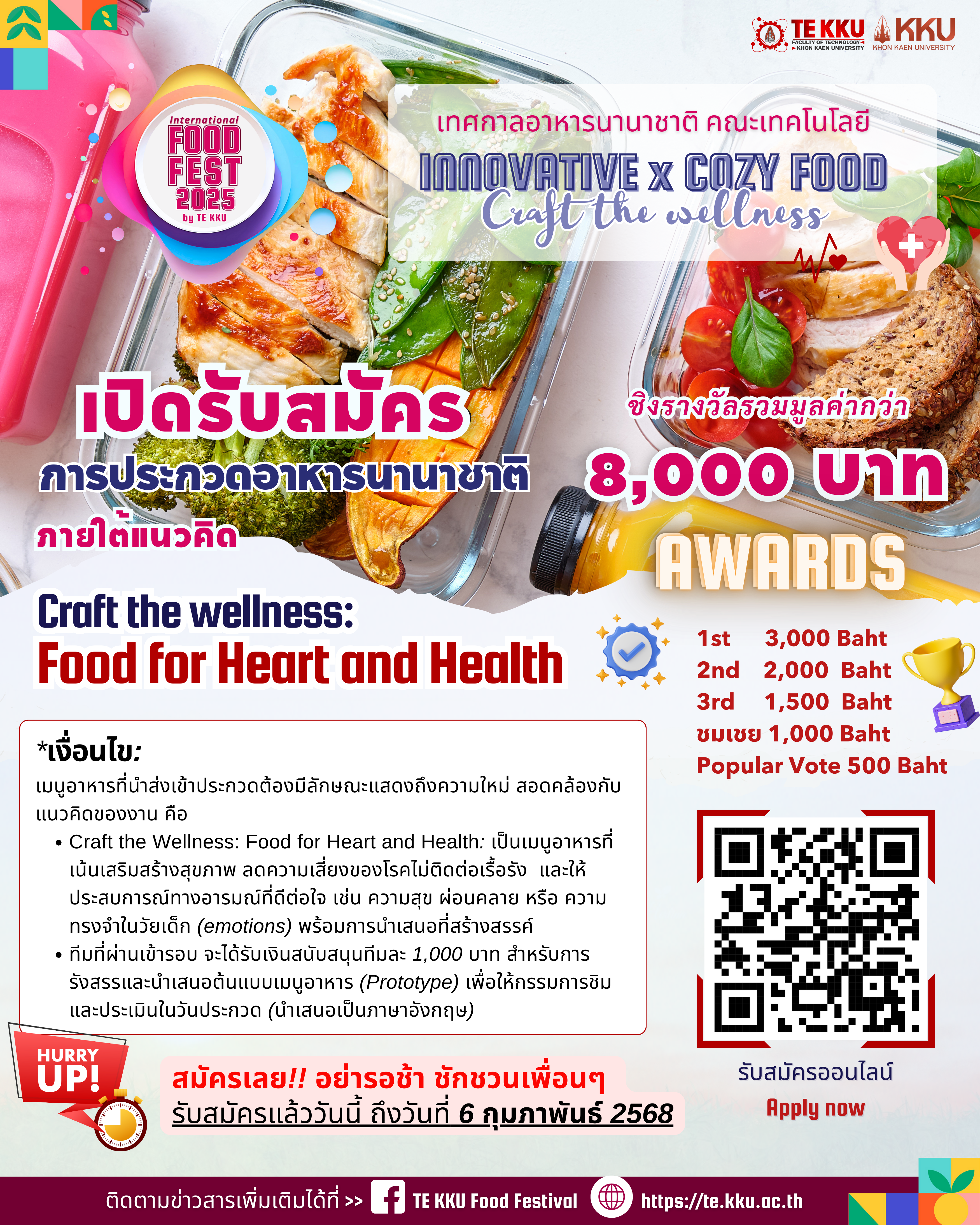 🌟 เชิญชวนน้องๆ นักศึกษาระดับมหาวิทยาลัยทั่วประเทศ เข้าร่วมประกวดสร้างสรรค์เมนูสุขภาพ TE KKU International Food Festival 2025 presents “INNOVATIVE x COZY FOOD Competition”