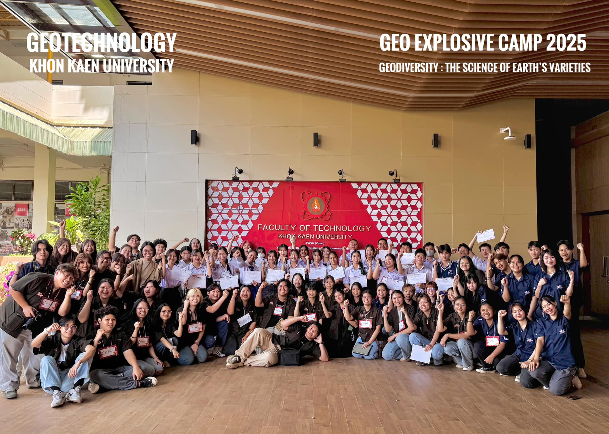 เมื่อวันที่ 21 กุมภาพันธ์ 2568 สาขาวิชาเทคโนโลยีธรณี คณะเทคโนโลยี มหาวิทยาลัยขอนแก่น จัดพิธีเปิด “ค่ายวิชาการ Geo Explosive Camp (GEC)” ประจำปีการศึกษา 2567 โดยมี ผศ.ดร.อารยา เชาว์เรืองฤทธิ์ คณบดีคณะเทคโนโลยี เป็นประธานในพิธี พร้อมด้วย ผศ.นุศรา สุระโคตร รองคณบดีฝ่ายการศึกษา พัฒนานักศึกษาและศิษย์เก่าสัมพันธ์ และ ผศ.เกียรติศักดิ์ ศรภิรมย์ หัวหน้าสาขาวิชาเทคโนโลยีธรณี ร่วมกล่าวเปิดค่าย ในการนี้มีนักเรียนระดับมัธยมศึกษาตอนปลายจากโรงเรียนต่างๆ เข้าร่วมกิจกรรมจำนวน 30 คน และนักศึกษาสาขาวิชาเทคโนโลยีธรณีอีกกว่า 70 คน ร่วมกิจกรรม ณ บริเวณพิพิธภัณฑ์ธรณีวิทยา สาขาวิชาเทคโนโลยีธรณี มหาวิทยาลัยขอนแก่น