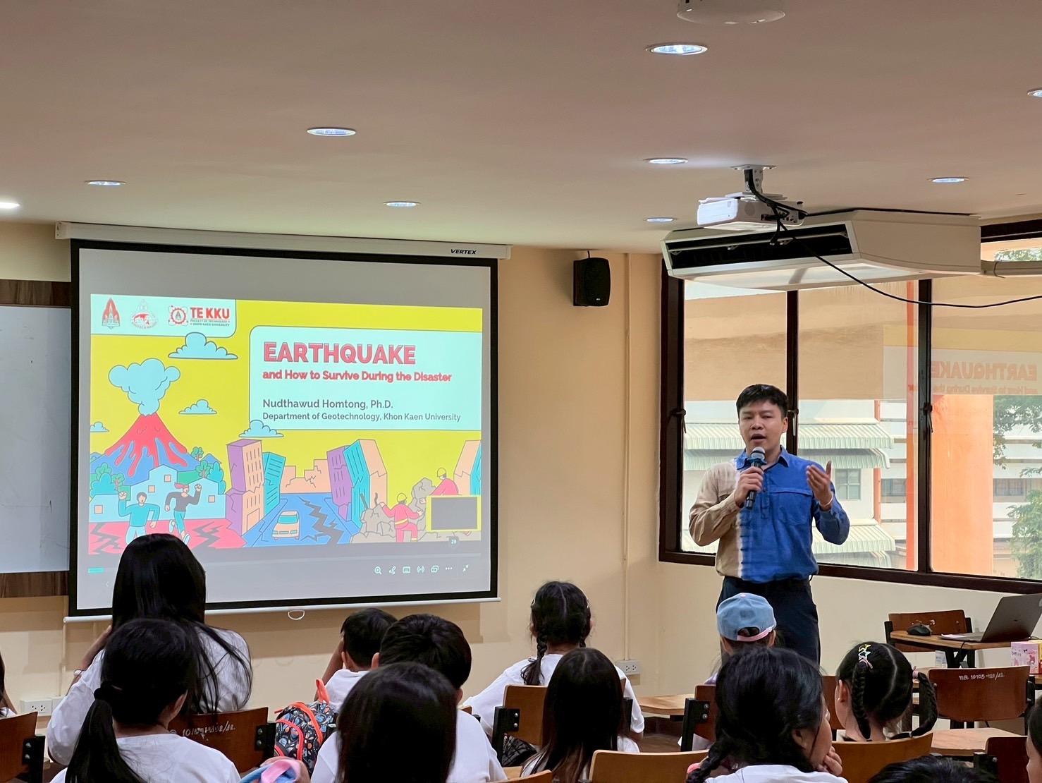 สาขาวิชาเทคโนโลยีธรณี คณะเทคโนโลยี มหาวิทยาลัยขอนแก่น ร่วมสร้างแรงบันดาลใจให้กับนักเรียนระดับประถมศึกษา จากโรงเรียนขอนแก่นวิเทศศึกษา ผ่านกิจกรรม “ค่ายเอาตัวรอดจากมหันตภัยต่าง ๆ” ภายใต้ชุดกิจกรรมความรู้ “Earthquakes and How to Survive During the Disaster” เมื่อวันที่ 27 มีนาคม 2568
