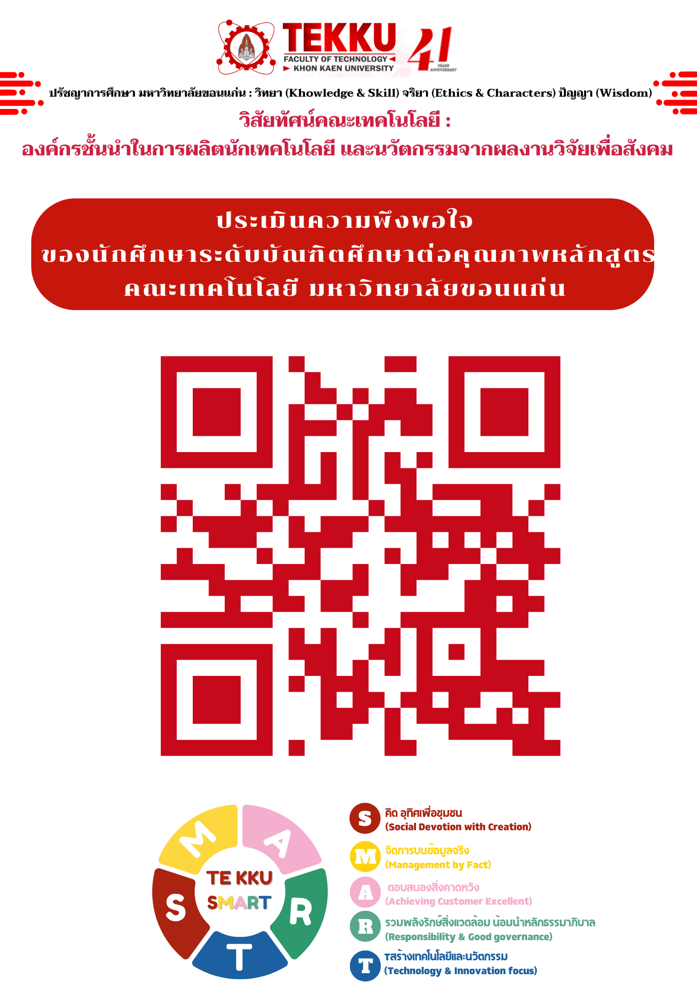 คณะเทคโนโลยี มหาวิทยาลัยขอนแก่น ขอเชิญชวนนักศึกษาระดับบัณฑิตศึกษาทุกท่านเข้าร่วมตอบแบบสอบถาม ประเมินความพึงพอใจต่อคุณภาพหลักสูตร เพื่อเป็นข้อมูลในการพัฒนาหลักสูตรให้ดียิ่งขึ้น