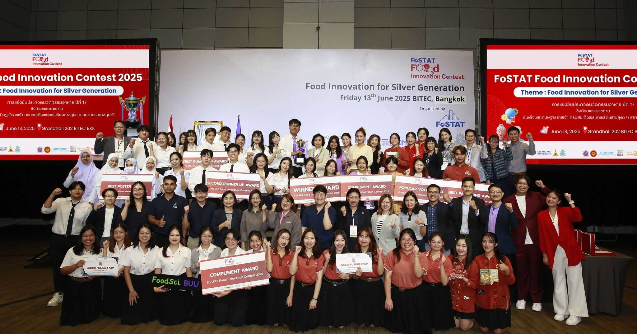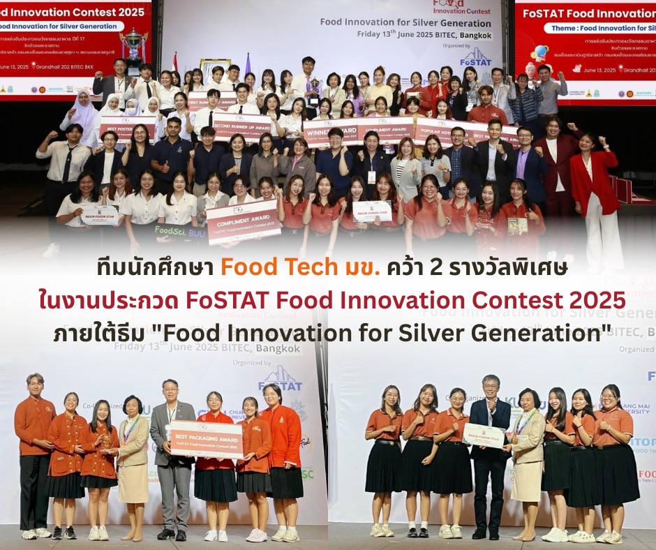 เมื่อวันที่ 13 มิถุนายน 2568 ที่ผ่านมา อาจารย์และนักศึกษาจากสาขาวิชาเทคโนโลยีการอาหาร คณะเทคโนโลยี มหาวิทยาลัยขอนแก่น ได้เข้าร่วมการแข่งขัน FoSTAT Food Innovation Contest 2025 ณ กรุงเทพมหานคร ภายใต้ธีม “Food Innovation for Silver Generation” หรือ “นวัตกรรมอาหารเพื่อสังคมผู้สูงอายุ” ซึ่งเป็นเวทีระดับชาติที่รวบรวมนักศึกษาด้านวิทยาศาสตร์และเทคโนโลยีอาหารจากมหาวิทยาลัยชั้นนำทั่วประเทศเข้าร่วมประชันไอเดียและนวัตกรรมอาหารรูปแบบใหม่