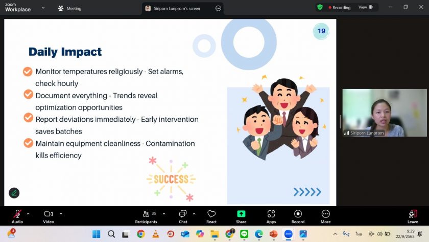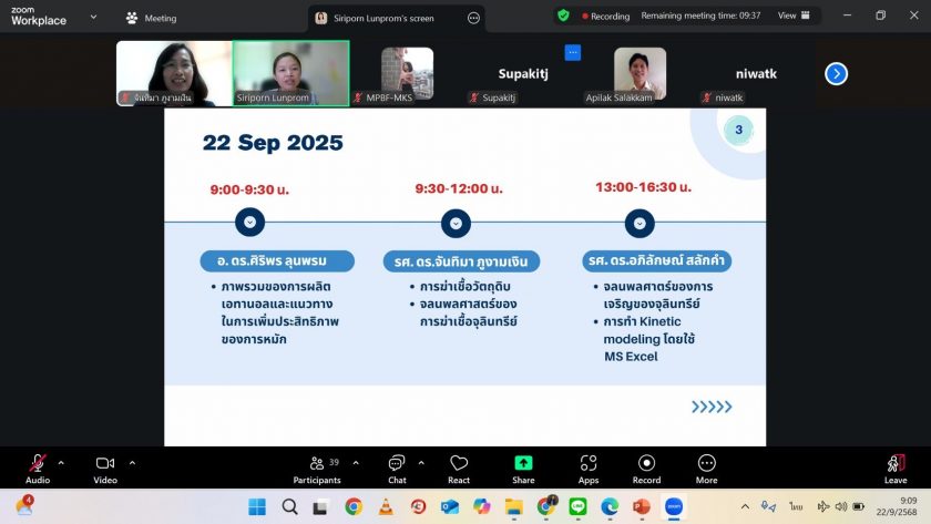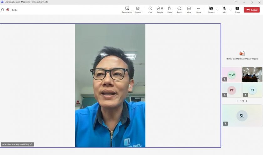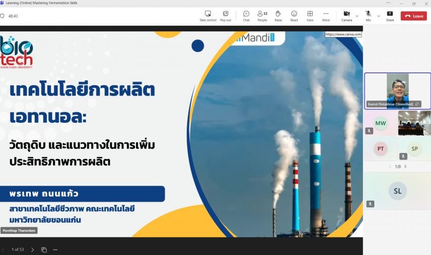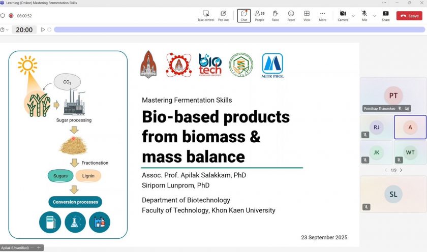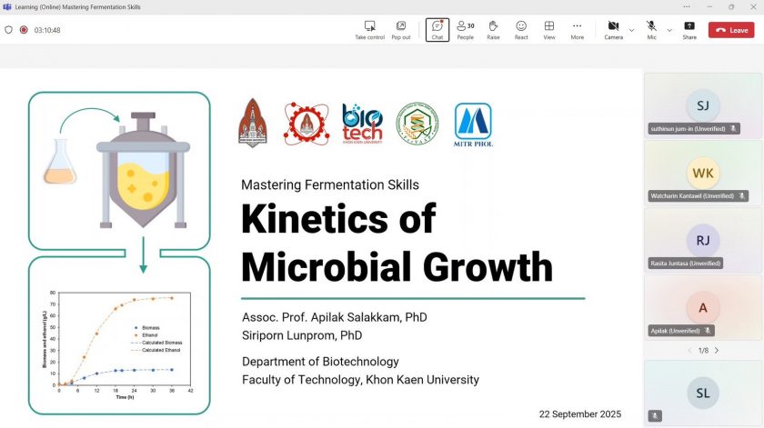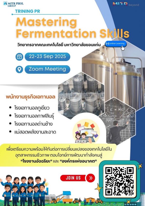 คณะเทคโนโลยี มหาวิทยาลัยขอนแก่น ได้จัดกิจกรรมพัฒนาบุคลากรครั้งสำคัญ โดยจัดหลักสูตรอบรมพิเศษในรูปแบบออนไลน์ ในหัวข้อ “Mastering Fermentation Skills” ให้แก่ทีมวิศวกรและบุคลากรจาก กลุ่มมิตรผล เพื่อเสริมสร้างและยกระดับความรู้ความเชี่ยวชาญด้านกระบวนการหมัก การอบรมจัดขึ้นในรูปแบบออนไลน์ เมื่อวันที่ 22-23 กันยายน 2568 ที่ผ่านมา โดยมีบุคลากรจากสายงานสำคัญของกลุ่มมิตรผลเข้าร่วมอย่างคับคั่ง อาทิ สายงานการผลิต พัฒนากระบวนการ วางแผนผลิต บริหารคุณภาพ และวิเคราะห์จุลชีววิทยา จากโรงงานเอทานอลในเครือได้แก่ โรงเอทานอลภูเขียว โรงเอทานอลกาฬสินธุ์ โรงเอทานอลด่านช้าง และแม่สอดพลังงานสะอาด