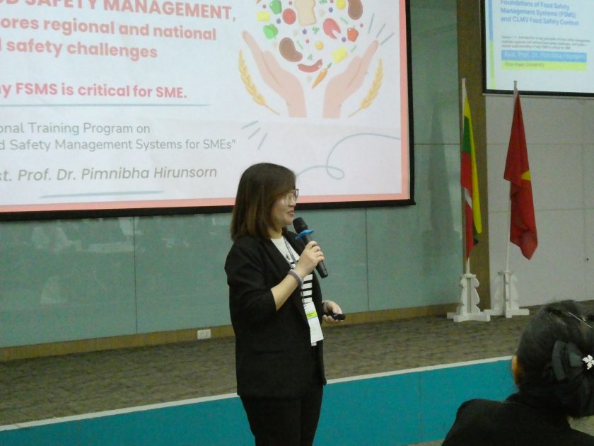 ผู้ช่วยศาสตราจารย์ ดร.พิมพ์นิภา หิรัณย์สร ในฐานะวิทยากรหลัก ได้ถ่ายทอดความรู้เกี่ยวกับหลักการสำคัญของระบบการจัดการความปลอดภัยอาหาร (Foundations of Food Safety Management Systems (FSMS) and CLMV Food Safety Context)” รวมถึง ระบบสุขลักษณะที่ดี (Good Hygiene Practices: GHPs) การวิเคราะห์อันตรายและจุดวิกฤตที่ต้องควบคุม (Hazard Analysis and Critical Control Points: HACCP) และมาตรฐาน ISO 22000