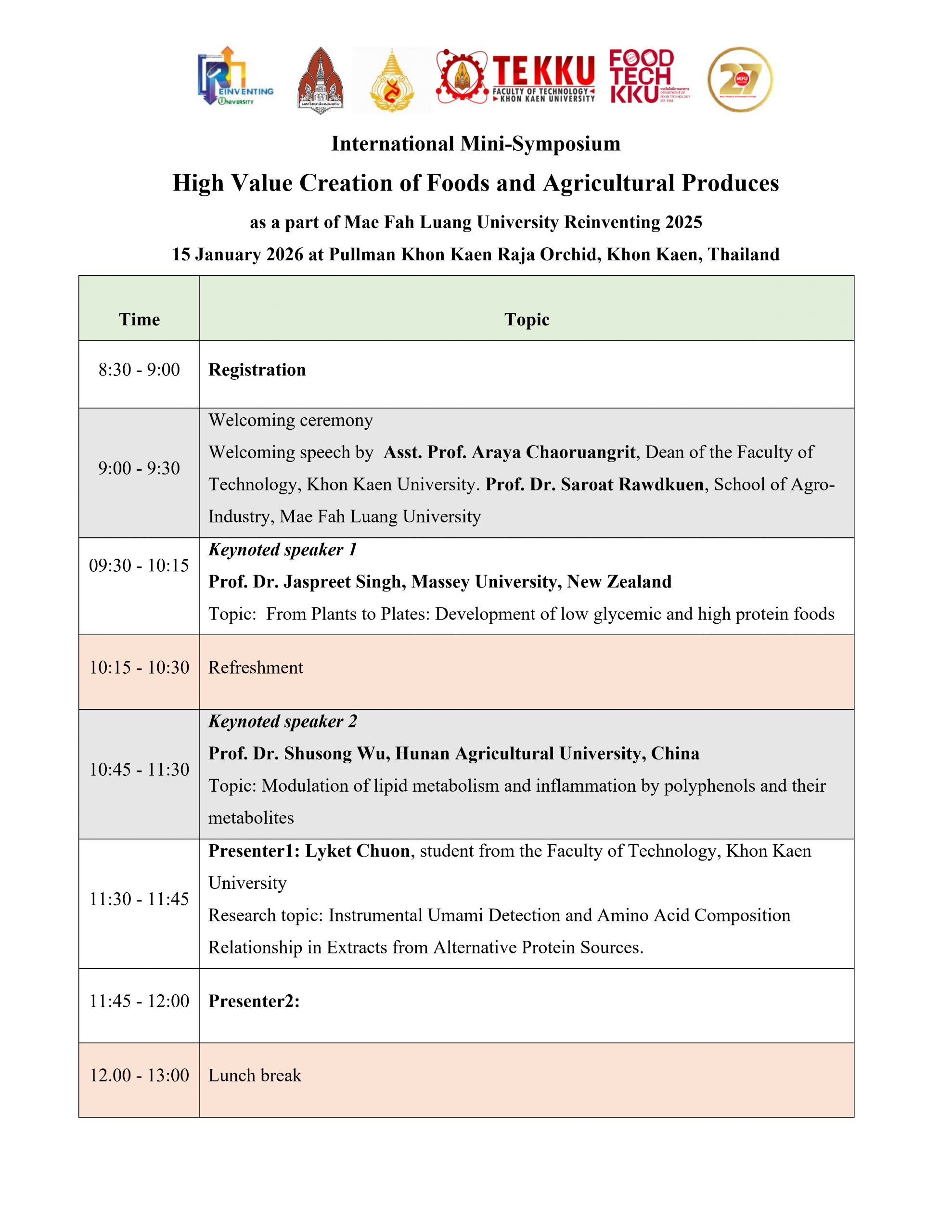 We cordially invite you to attend the International Mini-Symposium on High Value Creation of Foods and Agricultural Produces, an exciting event organized as a part of the Mae Fah Luang University Reinventing 2025 initiative.