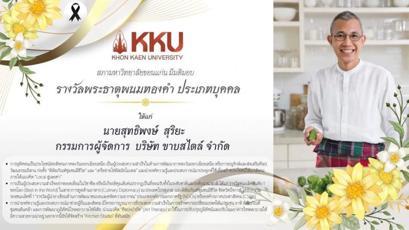 เมื่อวันที่ 18 ธันวาคม 2568 คณะเทคโนโลยี มหาวิทยาลัยขอนแก่น ขอแสดงความยินดีกับ คุณสุทธิพงษ์ สุริยะ กรรมการผู้จัดการ บริษัท ขาบสไตล์ จำกัด ผู้ทรงคุณวุฒิวิพากษ์หลักสูตรวิทยาศาสตร์และเทคโนโลยีการประกอบอาหาร คณะเทคโนโลยี มหาวิทยาลัยขอนแก่น ผู้ขับเคลื่อนแนวคิดและปรัชญาการพัฒนา “นำ Local สู่เลอค่า” ในโอกาสได้รับ รางวัลพระราชทานพระธาตุพนมทองคำ มหาวิทยาลัยขอนแก่น ประจำปี 2568 ซึ่งมีผู้ได้รับรางวัลเพียง 1 ราย ในปีนี้ รางวัลดังกล่าวประกอบด้วย 1. เข็มกลัดทองคำแท้ น้ำหนัก 1 บาท 2. เงินรางวัลจำนวน 200,000 บาท