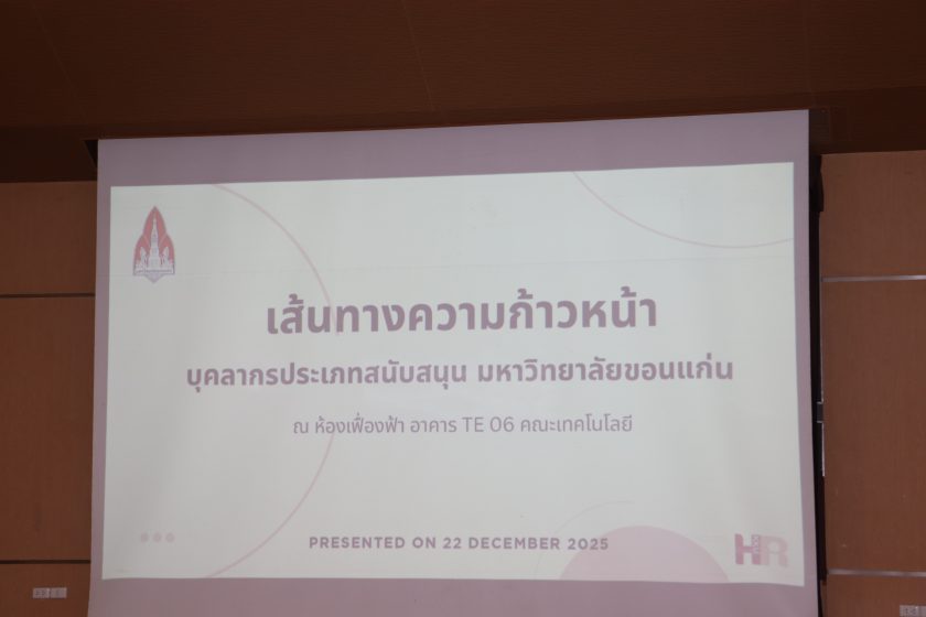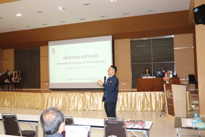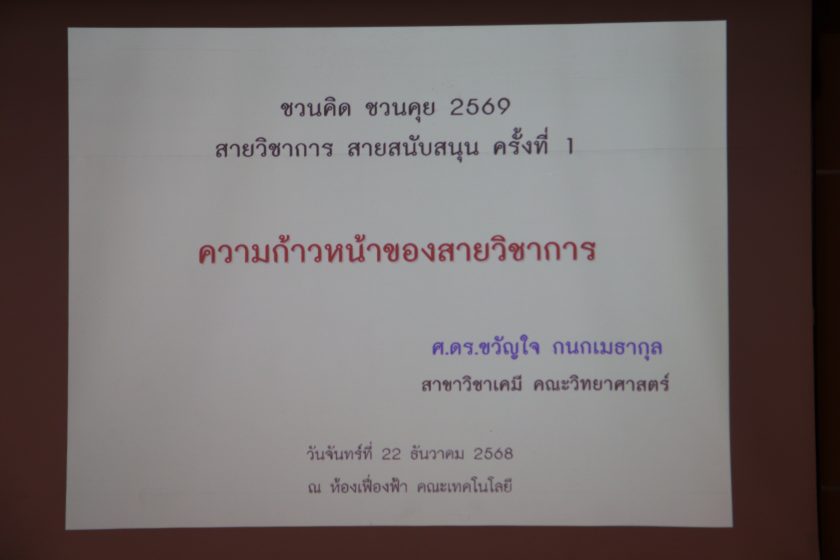 เมื่อวันจันทร์ที่ 22 ธันวาคม พ.ศ.2568 เวลา 13.00 น. โดย ผศ.ดร.อารยา เชาว์เรืองฤทธิ์ คณบดีคณะเทคโนโลยี มข. พร้อมด้วย คณะผู้บริหาร คณาจารย์ บุคลากรคณะเทคโนโลยี มข. เข้าร่วมกิจกรรมชวนคิด ชวนคุย ประจำปี 2569 ซึ่งในการนี้ได้รับเกียรติจาก ศ.ดร.ขวัญใจ กนกเมธากุล สาขาวิชาเคมี คณะวิทยาศาสตร์ และ คุณสถิตย์ แก้วบุดดา ผู้อำนวยการทรัพยากรบุคคล มข. และทีมงาน ได้มาให้ความรู้และแนวทางความก้าวหน้าของสายวิชาการและสายสนับสนุนของบุคลากรคณะเทคโนโลยี มข. พร้อม การตอบ-ถาม ข้อสงสัยแนวทางการปฏิบัติเพื่อความก้าวหน้าของสายวิชาการและสายสนับสนุน