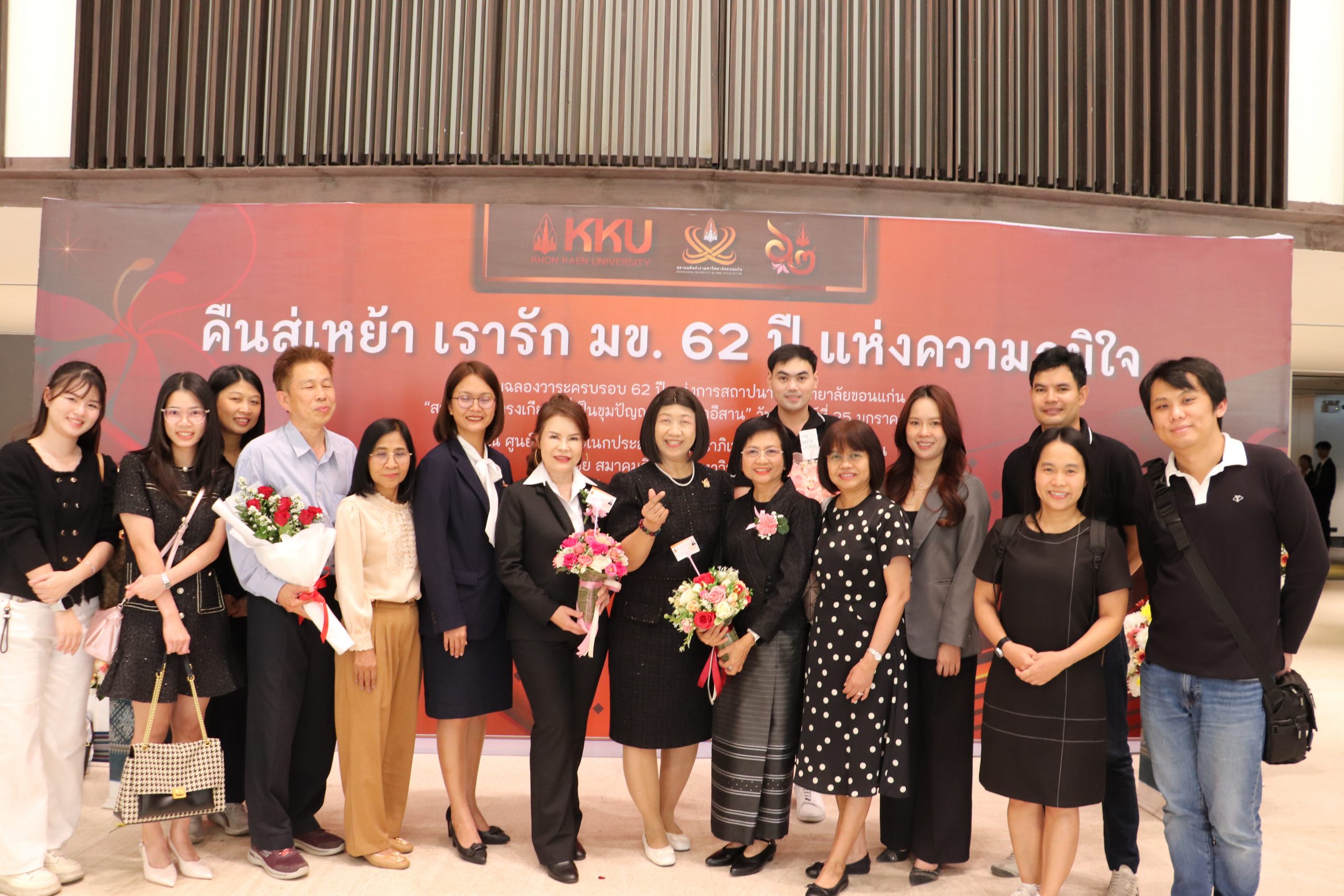 เมื่อวันอาทิตย์ที่ 25 มกราคม พ.ศ.2569 เวลา 14.30 – 23.00 น. ผศ.ดร.อารยา เชาว์เรืองฤทธิ์ คณบดีคณะเทคโนโลยี รศ. ดร.วิมลทิพย์ สิงห์เถื่อน รองคณบดีฝ่ายการศึกษา ดิจิทัลและกิจการนักศึกษา พร้อมด้วย คณาจารย์ บุคลากร คณะเทคโนโลยี ได้เข้าร่วม ง”คืนสู่เหย้า เรารักมข. 62 ปี แห่งความภาคภูมิใจ” และวันคล้ายวันสถาปนามหาวิทยาลัยขอนแก่น ณ ศูนย์ประชุมอเนกประสงค์กาญจนาภิเษก มหาวิทยาลัยขอนแก่นในการนี้ได้เข้าร่วมแสดงความชื่นชมยินดีกับศิษย์เก่าดีเด่น คณะเทคโนโลยี มข. ที่ได้สรรค์สร้างชื่อเสียงสาธารณประโยชน์ให้กับคณะเทคโนโลยี พร้อมได้มอบช่อดอกไม้และถ่ายภาพร่วมกัน