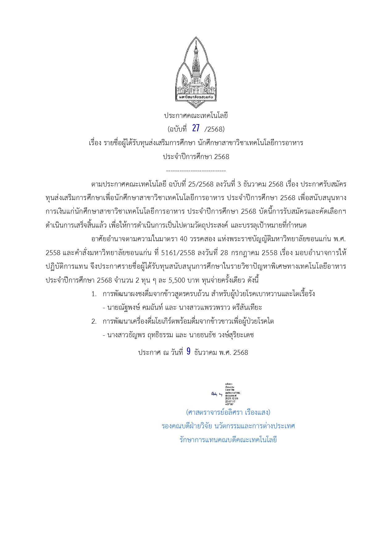 ประกาศรายชื่อผู้ได้รับทุนส่งเสริมการศึกษา นักศึกษาสาขาวิชาเทคโนโลยีการอาหาร ประจําปีการศึกษา 2568 28 January 202628 January 2026 Priyachart Srisuthom ข่าวทุนการศึกษา, ข่าวประชาสัมพันธ์ 24 Priyachart Srisuthom