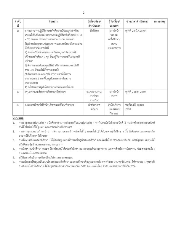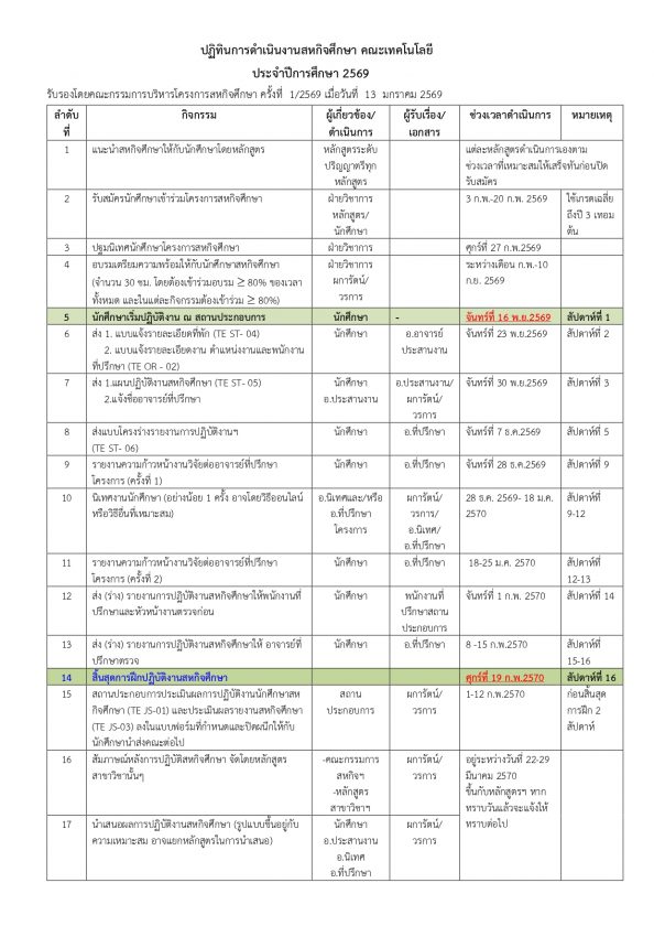 ปฏิทินการดำเนินงานสหกิจศึกษาคณะเทคโนโลยี ประจำปีการศึกษา 2569 3 February 20263 February 2026 Priyachart Srisuthom การศึกษา/รับสมัคร, ข่าวประชาสัมพันธ์ 62 สามารถสมัครได้ตั้งแต่ : วันนี้ – 20 ก.พ. 2569 (ใช้เกรดเฉลี่ยถึงปี 3 เทอมต้น) เริ่มปฏิบัติงาน : วันจันทร์ 16 พ.ย. 2569 สิ้นสุดปฏิบัติงาน : วันศุกร์ 19 พ.ย. 2570 Priyachart Srisuthom