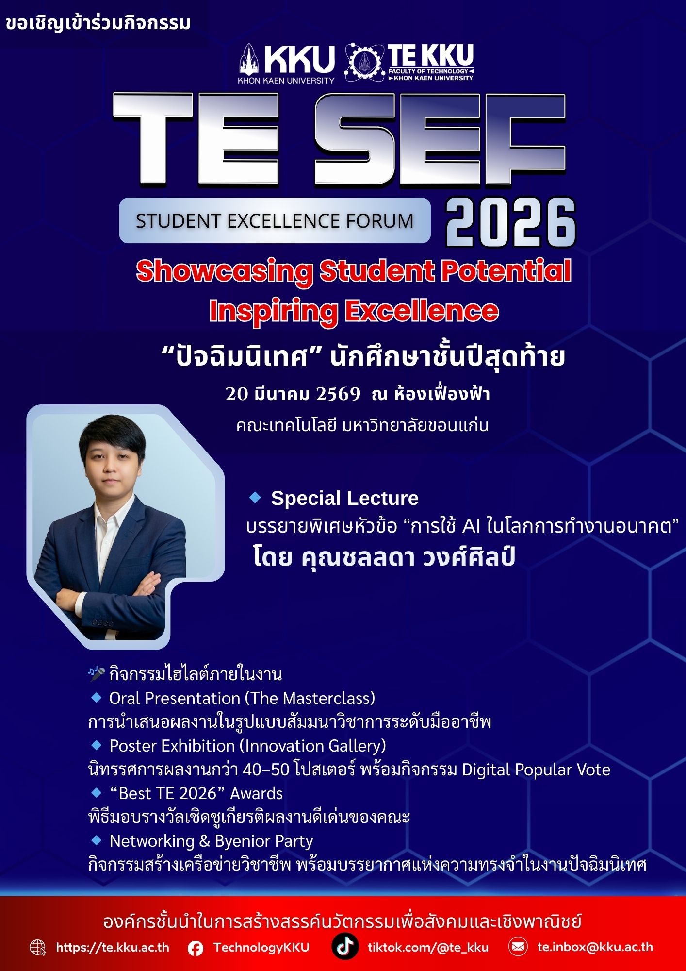 ขอเชิญนักศึกษาคณะเทคโนโลยี มข. ร่วมกิจกรรมนำเสนอผลงานสหกิจศึกษาและโครงงานพิเศษในเวทีแห่งความภาคภูมิใจประจำปี 2569 Potential, Inspiring Excellence