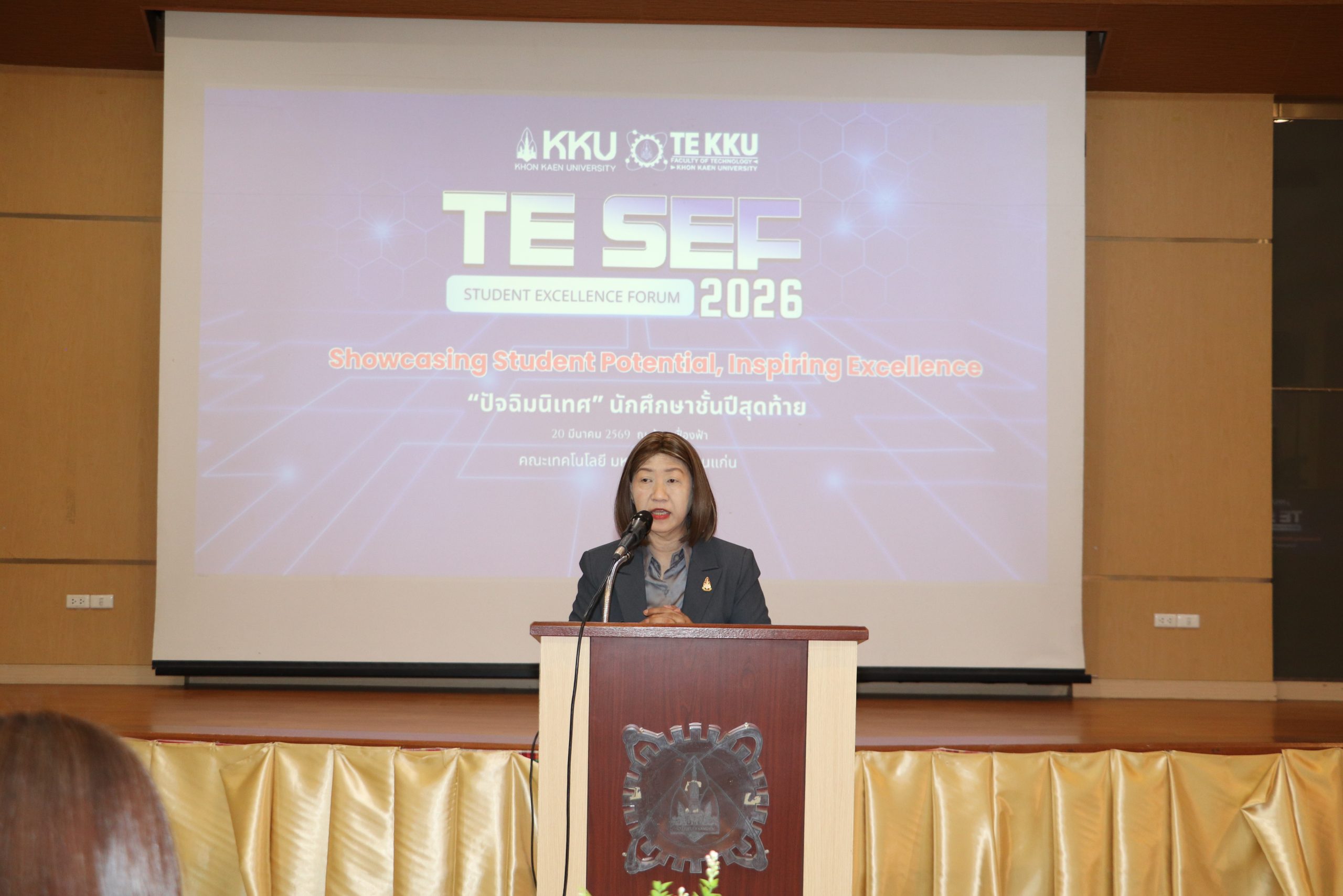 เมื่อวันศุกร์ที่ 20 มีนาคม พ.ศ. 2569 คณะเทคโนโลยี มหาวิทยาลัยขอนแก่น จัดกิจกรรม TE SEF (Student Excellence Forum) 2026 ร่วมกับกิจกรรมปัจฉิมนิเทศนักศึกษาชั้นปีที่ 4 โดยมี ผู้ช่วยศาสตราจารย์ ดร.อารยา เชาว์เรืองฤทธิ์ คณบดีคณะเทคโนโลยี เป็นประธานในพิธี พร้อมด้วยคณาจารย์ บุคลากร และนักศึกษาเข้าร่วมงาน ณ บริเวณด้านหน้าและภายในห้องเฟื่องฟ้า คณะเทคโนโลยี มหาวิทยาลัยขอนแก่น