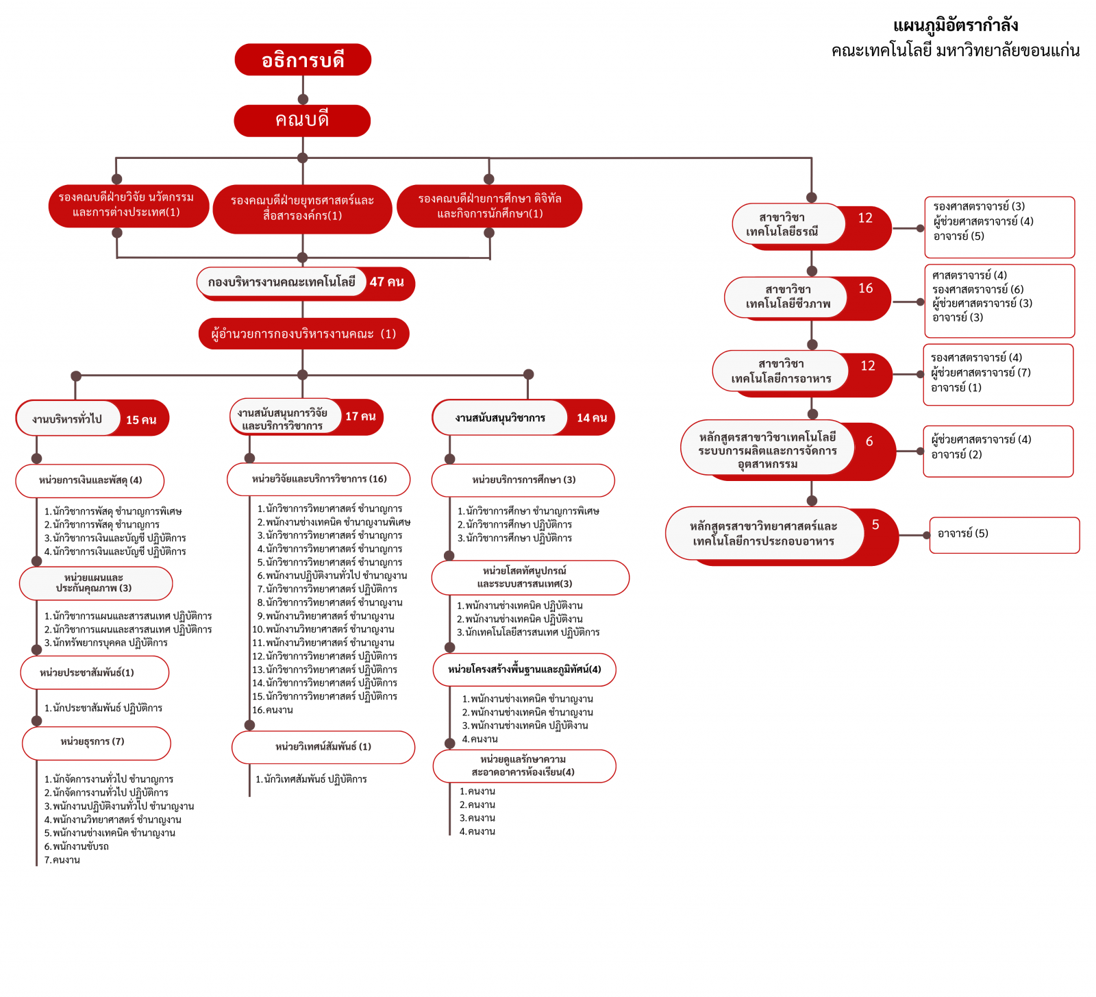 - ส่วนสนับสนุนพันธกิจ: กองบริหารงานคณะ มีหน้าที่หลักในการสนับสนุนการดำเนินงานต่างๆ ของคณะเพื่อให้บรรลุพันธกิจ ได้แก่ งานสนับสนุนวิชาการ งานสนับสนุนวิจัยและบริการวิชาการ และงานจัดการทั่วไป