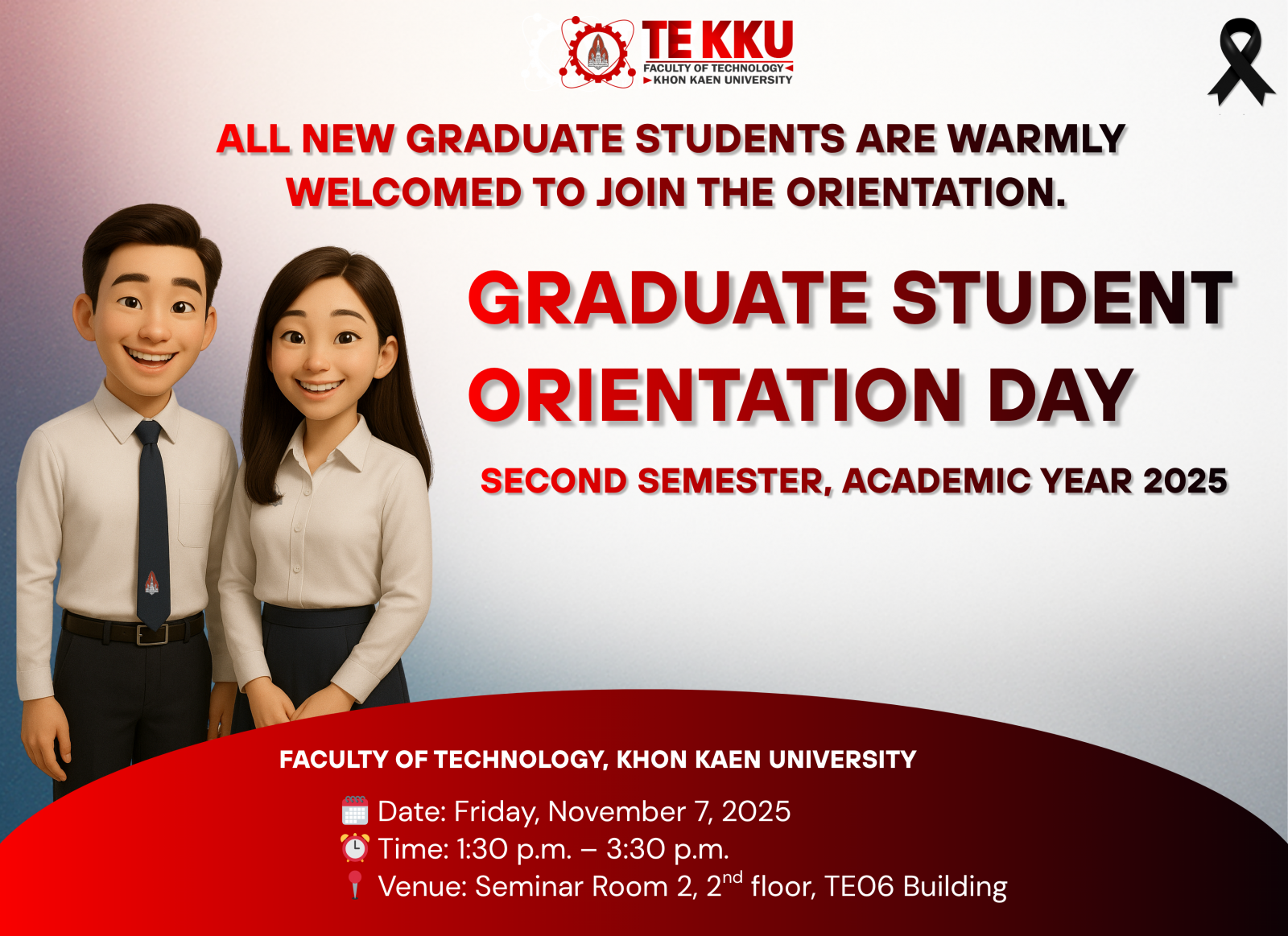 คณะเทคโนโลยี มหาวิทยาลัยขอนแก่น ขอเชิญนักศึกษาใหม่ระดับบัณฑิตศึกษาทุกท่าน เข้าร่วมงาน ปฐมนิเทศนักศึกษาใหม่ระดับบัณฑิตศึกษา ภาคการศึกษาปลาย ปีการศึกษา 2568 วันศุกร์ที่ 15 พฤศจิกายน พ.ศ. 2568 เวลา 13.30 – 15.30 น. ณ ห้องสัมมนา 2 อาคาร TE06