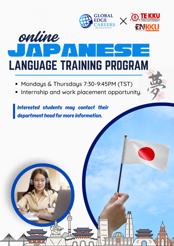 The Faculty of Technology, Khon Kaen University, is excited to announce a new opportunity for students interested in building careers in Japan! In collaboration with Global Edge Careers and TEKKU, we’re offering an online Japanese Language Training Program starting in 2026.